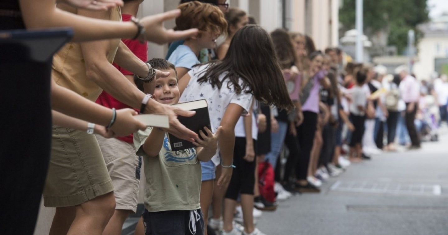 In oltre 600 hanno dato vita alla catena umana che ha trasferito 600 volumi del patrimonio librario cantonale dal Liceo al Centro culturale La Filanda