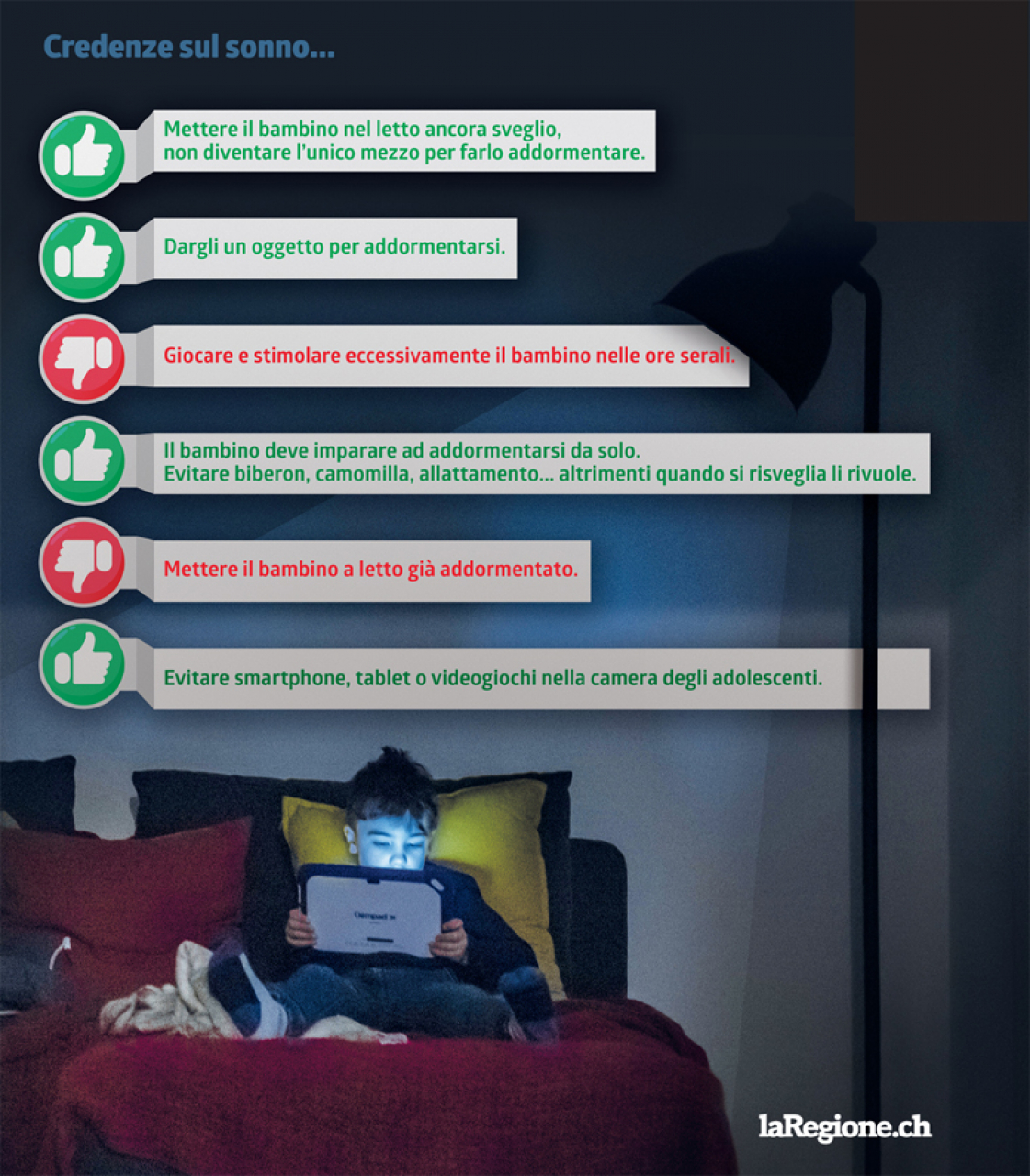 Un altro aspetto molto studiato dagli esperti è l’effetto della luce artificiale. «Molti genitori non sanno che i bambini sono molto più sensibili alla luce. L’esposizione nelle ore prima di dormire può sopprimere fino al 90% della produzione della melatonina», dice la ricercatrice evidenziando vari nuovi studi.