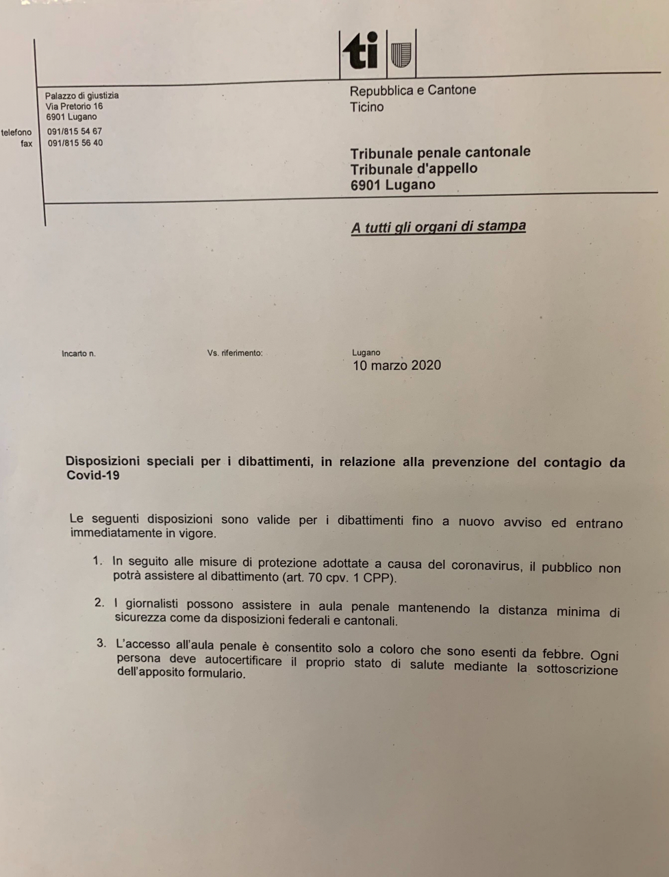 Ticino, misure anti coronavirus: da oggi, processi a porte chiuse
