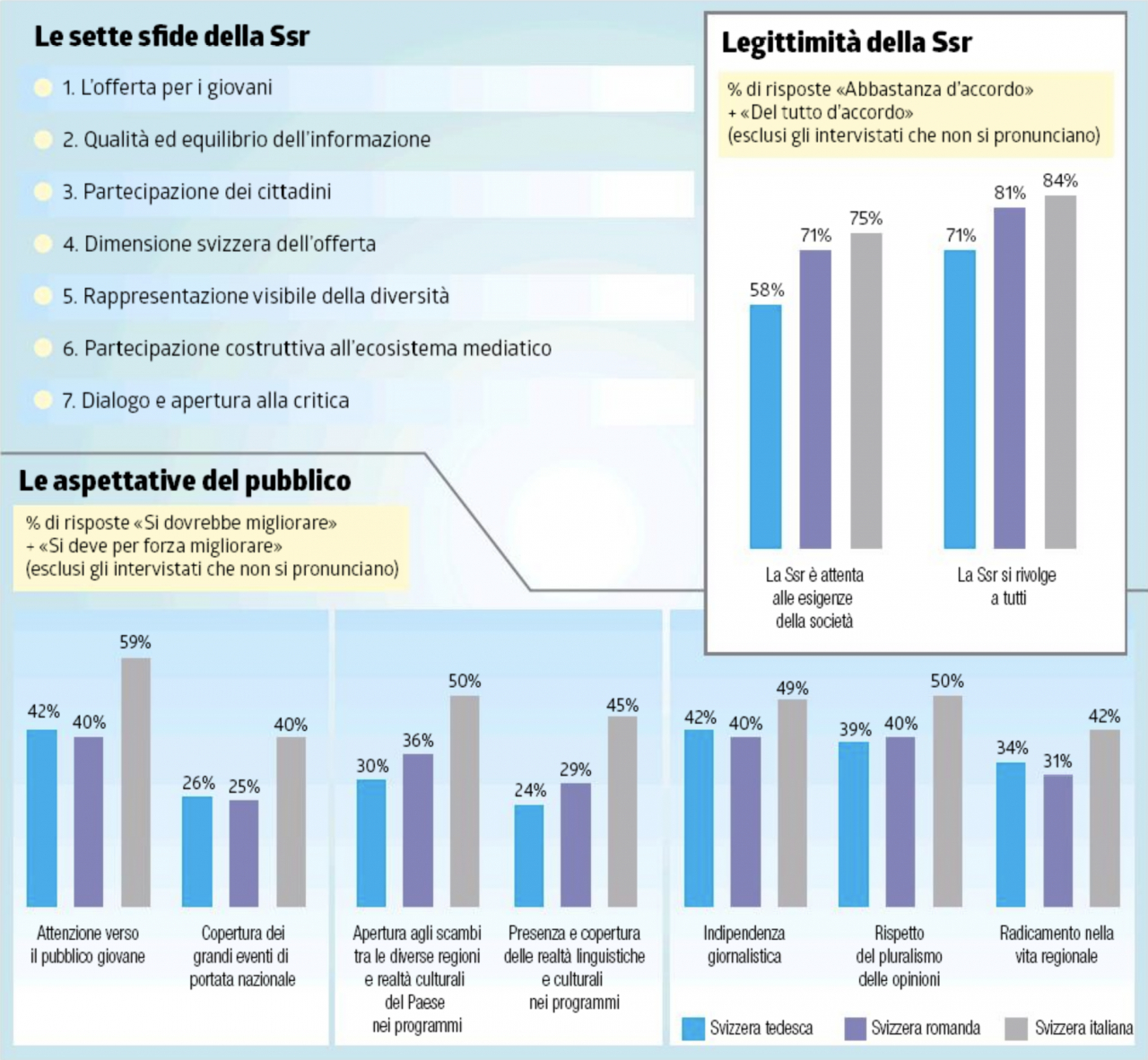 E a questo proposito è interessante andare a vedere, nel rapporto, quali sono le differenze tra le varie regioni linguistiche – all’interno, va detto, di un quadro complessivo abbastanza omogeneo: valori, punti di forza e criticità emersi sono grossomodo gli stessi. «Le aspettative della Svizzera italiana sono maggiori rispetto a quelle delle altre regioni linguistiche» ci ha spiegato Stefania Verzasconi, responsabile Stato maggiore comunicazione istituzionale della Rsi. Aspetti come l’indipendenza giornalistica, la qualità dell’informazione, l’offerta di programmi culturali e d’intrattenimento, la presenza di film e serie tv svizzeri sono maggiormente sentiti nella Svizzera italiana, a volte con margini superiori al 10% degli intervistati. Particolarmente sentite sono l’apertura agli scambi tra le diverse regioni, e la presenza, nei programmi delle realtà linguistiche e culturali, insieme all’attenzione verso il pubblico giovane. Aspettative più alte che potrebbero essere interpretate come insoddisfazione. Insomma, se nella Svizzera italiana metà degli intervistati afferma che bisogna migliorare il rispetto del pluralismo (contro il 40% del resto del Paese), magari è perché non è contenta dello stato attuale delle cose. Ma i dati, ha precisato sempre Verzasconi, dicono il contrario: «L’immagine che la Ssr ha nella Svizzera italiana è superiore al resto del Paese: le aspettative sono proporzionali alla percezione che si ha del servizio pubblico».