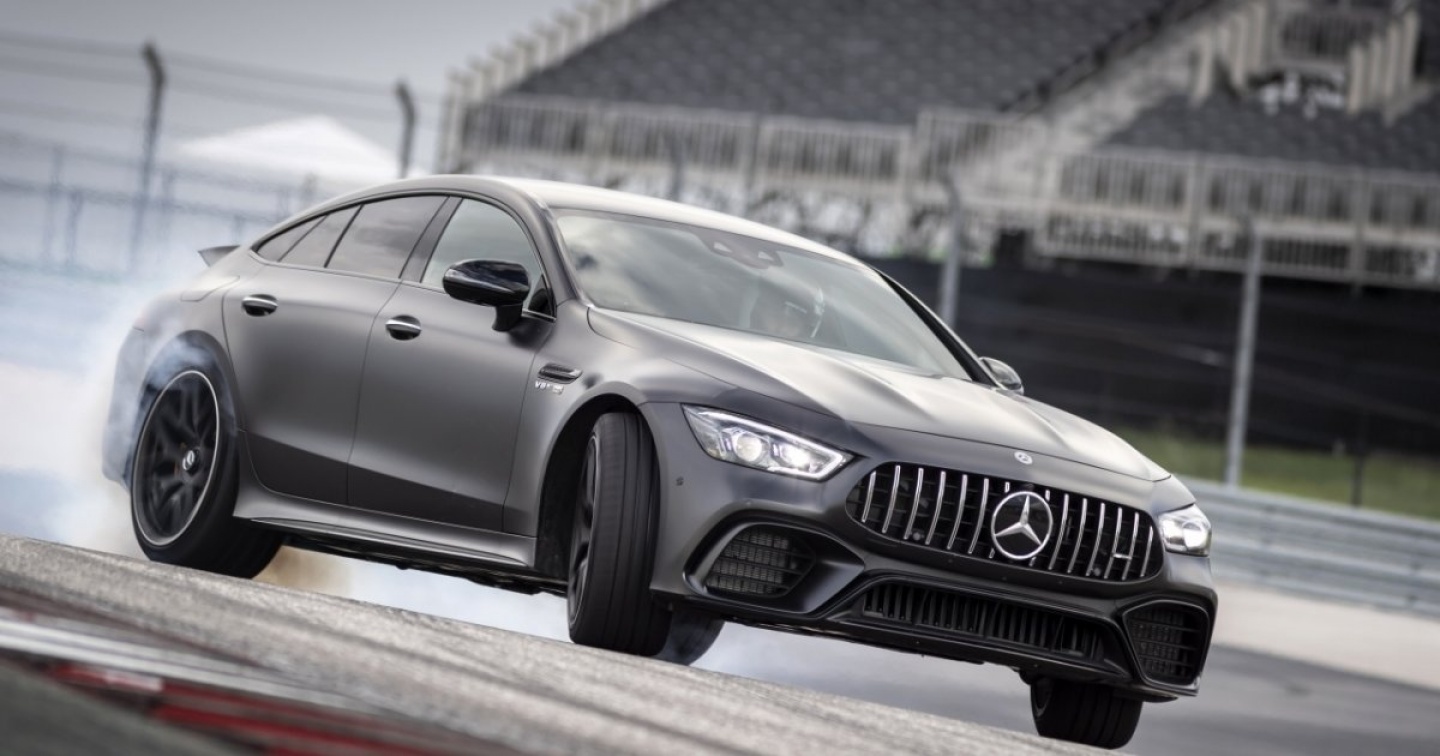 Come la due porte, ma con fruibilità da famiglia: l’inedita berlina al vertice della gamma AMG spinge a gran voce il design coupé con un profilo del tetto fortemente affusolato, la coda con portellone ed il frontale dominato dal profondo cofano con le distintive nervature longitudinali e la mascherina a listelli verticali. Rispetto al pianale di derivazione (Mercedes CLS), quello della nuova GT Coupé 4 vanta inoltre significativi irrigidimenti, mentre l’aerodinamica è sviluppata in funzione dell’aderenza attraverso l’ala mobile posteriore a carico variabile e la regolazione attiva del flusso d’aria di raffreddamento anteriore. Sotto il cofano, ritroviamo le conosciute unità a sei e otto cilindri, con al vertice il potente V8 biturbo di 4 litri da 639 cv e 900 Nm che “anima” la 63 S, impiegata per il test su strada e pista. Per scaricare a terra questi “numeri” fuori dell’ordinario sono impiegate numerose tecnologie ultima generazione come la trazione integrale adattiva 4Matic+, con differenziale posteriore autobloccante attivo e ripartizione della coppia tra gli assali variabile in modo continuo, la sterzata integrale e le sospensioni pneumatiche adattive. Specifico sulle motorizzazioni V8 è lo stesso cambio automatico a nove rapporti con frizione a lamelle multiple in bagno d’olio, che permette meno inerzia e passaggi marcia più secchi e rapidi nella modalità “Race”.