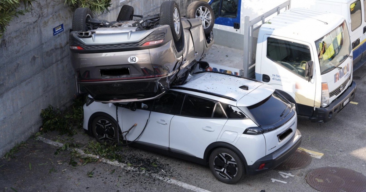 Automobilista fuori controllo alla rotonda. Dopo il litigio scappa e si ribalta. Ecco il video che mostra l’auto ribaltata sopra altri veicoli.