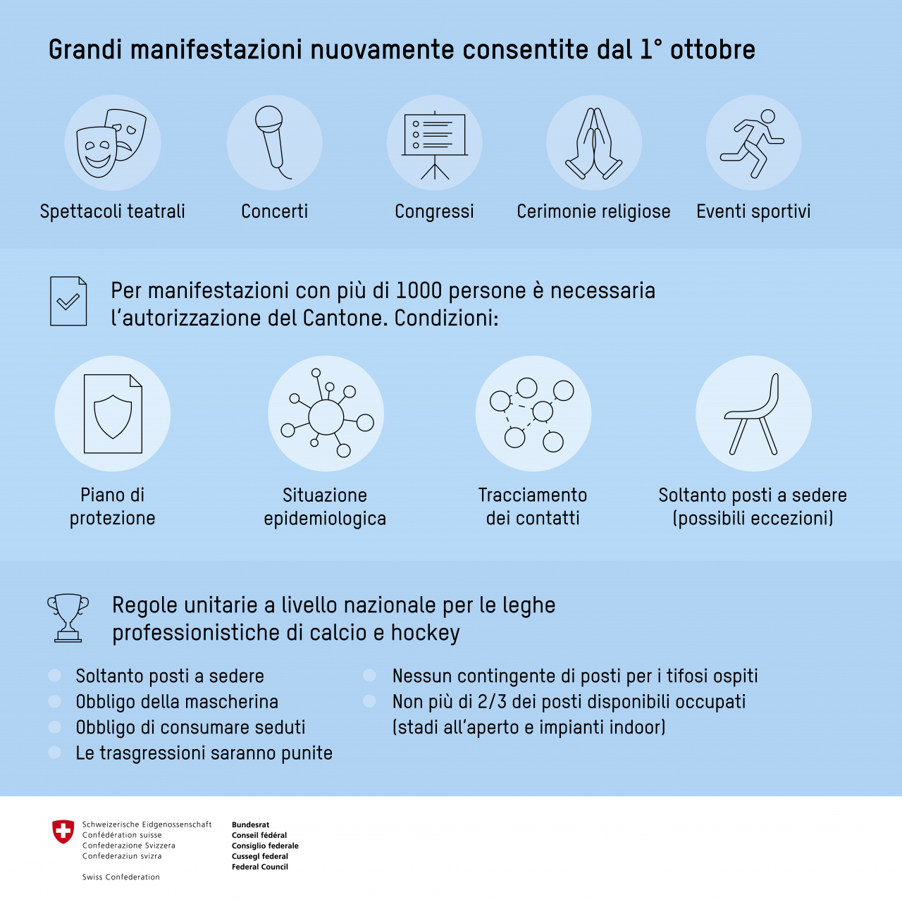 Negli stadi sono ammessi solo posti a sedere ed è richiesta una maschera. Sia negli stadi chiusi che all'aperto possono essere occupati un massimo di due terzi degli spazi. Il Consiglio federale lascia alle autorità preposte al rilascio delle licenze il compito di determinare l'entità dell'occupazione di uno stadio caso per caso. Non sono ammessi contingenti di spazio per i fan ospiti.