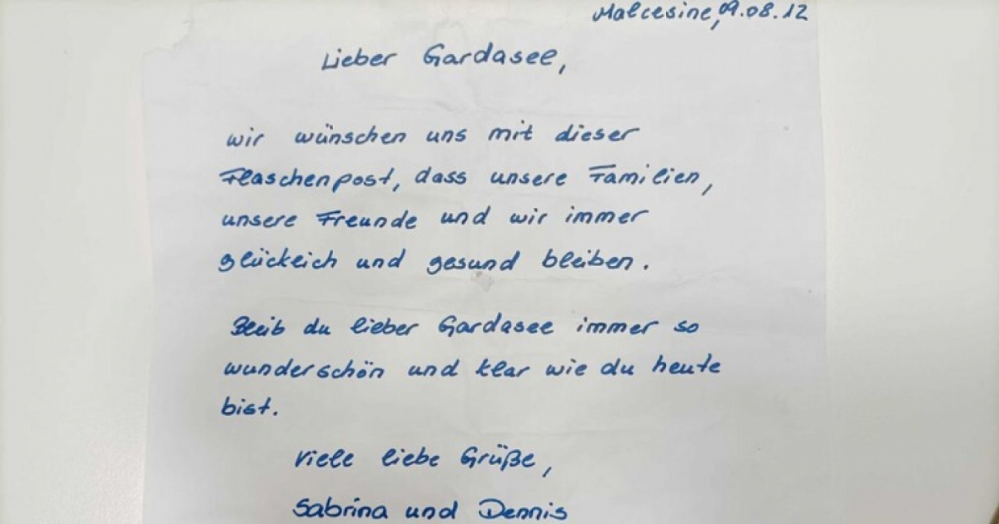 Il ritrovamento è avvenuto sulla riva di una delle spiagge del comune. È scritto a mano e firmato da Sabrina e Dennis, presumibilmente una coppia di Amburgo. La missiva consegnata alle acque ha un testo bene augurante per le vite dei due autori e per il futuro del lago: "Caro Lago di Garda - si legge in lingua tedesca - con questo messaggio in bottiglia ci auguriamo che le nostre famiglie, i nostri amici e noi restiamo sempre felici e in salute. Caro Lago di Garda, rimani bello e limpido come lo sei oggi".