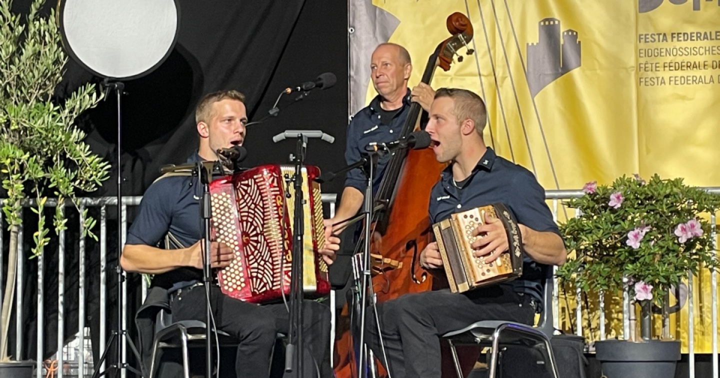 Al termine della loro esibizione, che alla Festa federale della musica popolare ha rotto il ghiaccio sotto il tendone di Piazza del Sole (per nulla garante a livello meteo ma l’organizzazione ineccepibile non ha fatto della battente pioggia un problema) incontriamo Cyril Rusch, suonatore d’organetto, il famoso schwyzerörgeli, e parte del trio Rusch-Büeblä, formato insieme al fratello gemello Simon e al padre Roger.
