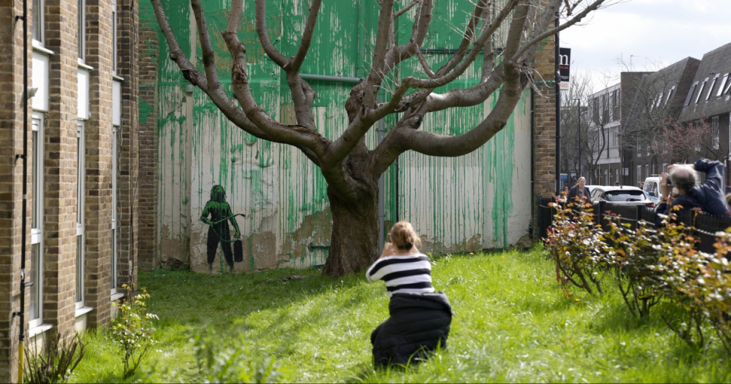Alla base della parete del palazzo, Banksy ha lasciato lo stencil di una ragazza con uno spruzzatore a pressione che guarda verso l'alto l'albero come per rendersi conto dell'effetto. “Banksy offre sempre diverse chiavi di lettura – spiega all'Ansa Stefano Antonelli, curatore di mostre importanti in Italia sullo street artist più famoso del mondo –. Il verde utilizzato potrebbe riferirsi al colore legato alla festa di San Patrizio celebrata domenica scorsa in Inghilterra. L'altro dettaglio riguarda la tonalità di verde, come quella dei cartelli della municipalità di Islington, dove si trova l'opera. Anche l'albero potrebbe avere una storia da raccontare che Banksy ha voluto portare all'attenzione del pubblico”.