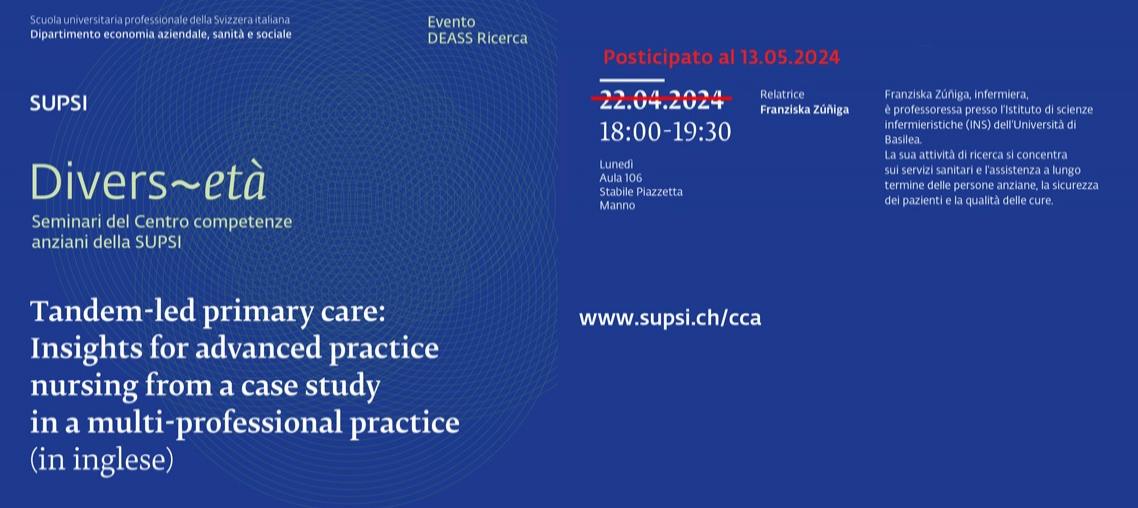 Si terrà lunedì 13 maggio 2024, dalle ore 18.00 alle 19.30, presso l'aula 106 dello Stabile Piazzetta a Manno il prossimo appuntamento della programmazione 2023 del ciclo di seminari Divers-età, organizzato dal Centro competenze anziani (CCA) del Dipartimento economia aziendale, sanità e sociale (DEASS). L’evento originariamente programmato per il mese di aprile è stato posticipato di alcune settimane.