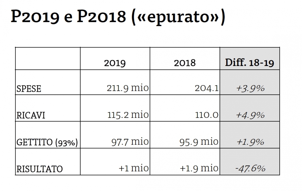 La tabella mostra sinteticamente il paragone fra Preventivo 2018 (P18) e Preventivo 2019 (P19). Per cui, nel 2019 le spese sono calcolate per circa 211 milioni di franchi, con un aumento del 3,9% rispetto alla cifra del 2018; i ricavi sono previsti nella misura di circa 115 milioni (nel 2018: 110 milioni; per un aumento del 4,9%). Il gettito (al 93%) dovrebbe attestarsi a circa 97 milioni di franchi (+1,9% rispetto al 2018, con 95,9 milioni). I dati portano al risultato di 1 milione nel 2019 (2018: +1,9 milioni; -47% rispetto all'anno venturo).