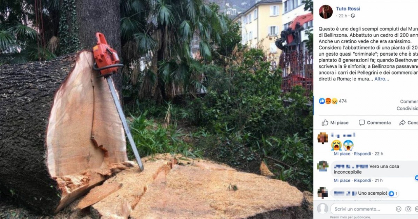 Leggendo il suo ultimo post su Facebook sembrerebbe che, in piena polemica per il possibile taglio del centinaio di alberi in viale Stazione (osteggiato, ricordiamo, da una petizione lanciata dai Verdi su change.org sostenuta da quasi 6'500 persone e consegnata la scorsa settimana al sindaco), il Municipio di Bellinzona abbia deciso di abbattere un grande cedro in un'altra zona della città. Albero che il consigliere comunale Udc Tuto Rossi definisce un cedro di 200 anni e per questo ritiene quanto compiuto dall'Esecutivo un "gesto criminale". Punta pertanto il dito contro sei municipali (escluso dunque il rappresentante del gruppo Lega Udc) "che aspirano solo alla loro rielezione e approvano la demolizione senza nessun rispetto della storia e della cultura della Città che devono governare".