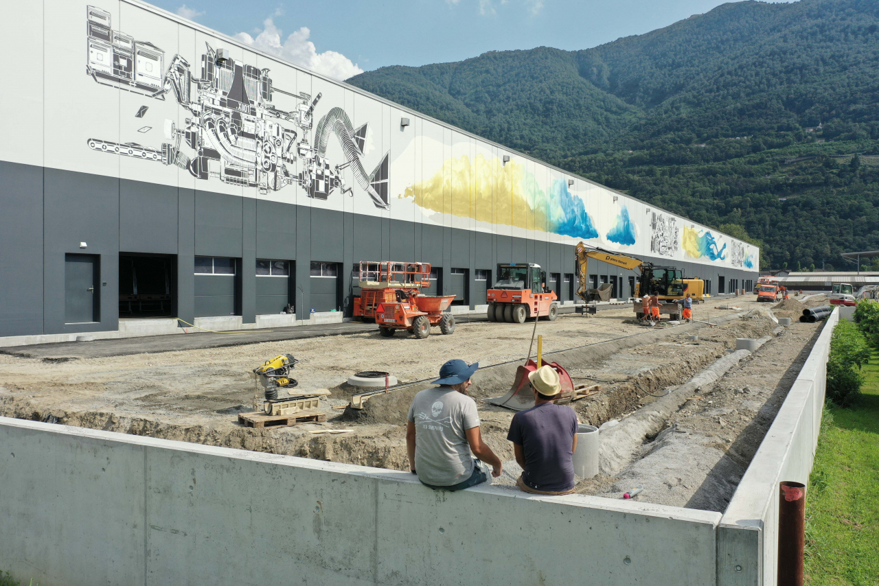 Centosessantotto metri di lunghezza, sei di altezza. Prima che Nevercrew (Pablo Togni e Christian Rebecchi) mettesse mano al futuro Centro pacchi regionale (Cpr) della Posta, la Svizzera non aveva mai visto una pittura murale così grande. Spiegata in parole povere, poverissime, tre macchine del cambiamento; spiegata da Rudy Chiappini sul primo catalogo dei due artisti ticinesi, stampato da Salvioni arti grafiche, “una nuova e immaginaria catena di montaggio che genera e trasforma la materia”, ovvero “l’artificiale creato dall’uomo chiamato a relazionarsi con il mondo naturale”. Detto in prima persona alla ‘Regione’, «spesso l’arte di strada è stata arte di protesta – spiega il curatore del volume – ma i tempi sono cambiati. Ora è anche un modo per comunicare messaggi, in questo caso quello relativo ai cambiamenti climatici. I macchinari, l’uomo, le catene di montaggio, che aspirano o emettono elementi naturali», in quella che «non è un’opera privata, ma pubblica, il cui scopo è anche far riflettere».