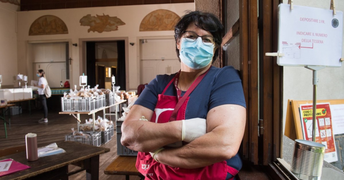 Farina per la polenta, biscotti, yogurt, bibite e barattoli con salsa di pomodoro. Ma anche pane, pollo, cioccolato di Pasqua. È tutto pronto e meticolosamente ordinato sui tavoli in attesa che i volontari inseriscano gli alimenti nel sacchetto della spesa. Pane più piccolo per persone singole, più grande per famiglie numerose. È venerdì pomeriggio all’oratorio San Biagio di Ravecchia, dove assistiamo al dietro le quinte di Tavolino magico, che nella Svizzera italiana con i suoi 14 centri di distribuzione contribuisce al fabbisogno di 1’800 persone. Esse e gli altri beneficiari di tutta la nazione (in totale circa 20mila beneficiari) a partire dallo scorso 16 marzo a causa dell’emergenza coronavirus hanno però dovuto rinunciare ai generi alimentari che solitamente ricevono ogni settimana. Una mancanza che ha pesato parecchio sul bilancio familiare, come conferma la responsabile del centro di distribuzione di Ravecchia Roberta Gioli. La incontriamo mentre spiega agli altri sei volontari presenti sul posto come procedere con la distribuzione dopo che il secondo furgone ha finito di svuotare il carico di generi alimentari in esubero (questa volta si tratta di circa 900 kg) donati dall’industria alimentare e dai supermercati.