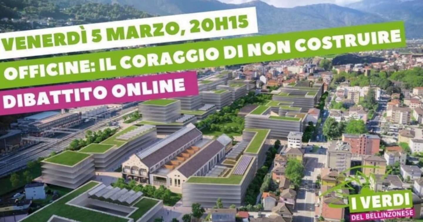 Venerdì 5 marzo dalle 20.15 in diretta sulle pagine Facebook dei Verdi del Ticino e dei Verdi del Bellinzonese si svolgerà un dibattito dal titolo “Officine: il coraggio di non costruire”. L’incontro, aperto a chiunque, vuole presentare le diverse sensibilità e visioni per il futuro del comparto delle Officine Ffs e discutere della pianificazione del territorio della Città e delle “principali sfide legate al calo demografico, al cambiamento climatico e alla necessità di preservare prezioso territorio”. Il dibattito partirà da un punto di vista diverso, rispetto a quelli finora emersi e rispetto a quello scelto dalla giuria di esperti che ha optato per il progetto 'Porta del Ticino'. La discussione partirà dall'opinione dell’architetto Gabriel Bertossa (originario di Roveredo, lavora a Parigi) che auspica un destino totalmente diverso per il sedime, con una visione intitolata “Il coraggio di non costruire”. Al dibattito parteciperanno anche Stefano Moor (architetto e docente al Seminario internazionale di architettura di Monte Carasso), Mario Branda (sindaco uscente e candidato Ps al Municipio), Marco Noi (granconsigliere dei Verdi e candidato al Municipio) e Jasmine Ben Ali (architetta e candidata al Municipio per la lista Lega, Udc e indipendenti). Il pubblico potrà interagire attraverso commenti su Facebook che saranno prontamente riportati agli ospiti.
