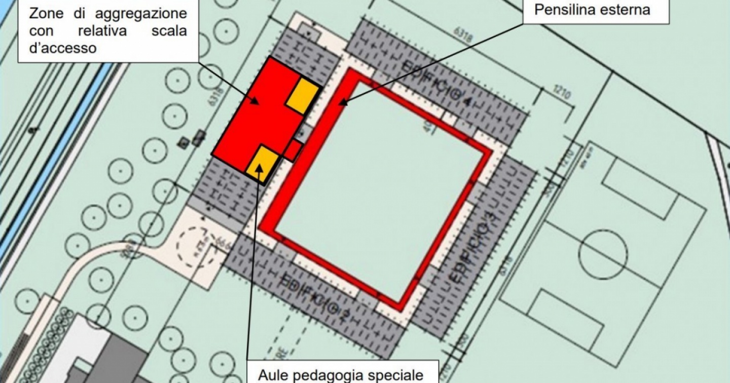 In rosso i nuovi spazi aggregativi e la pensilina