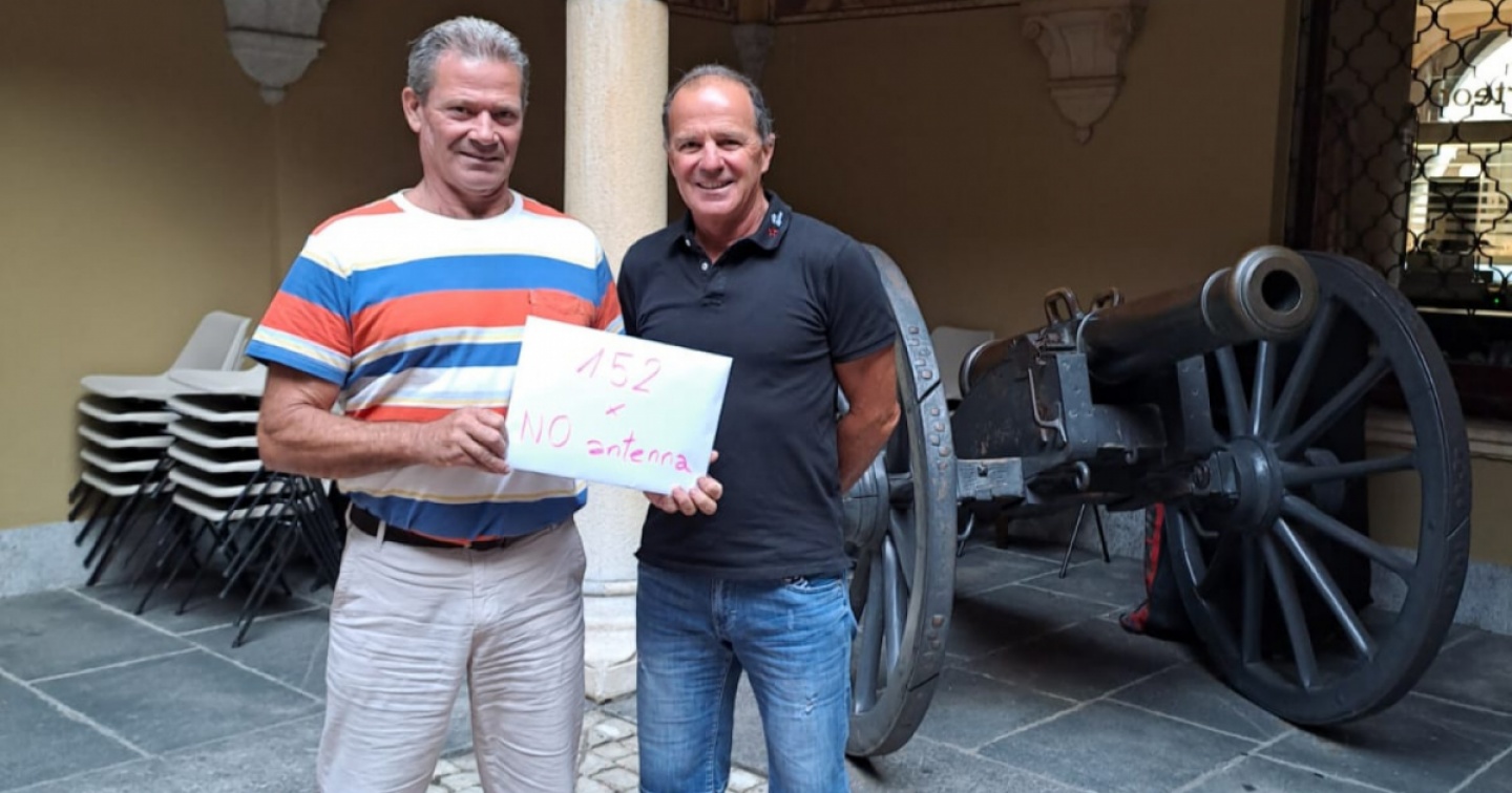 No e ancora no. Ripetuto 152 volte. Tante sono infatti le firme consegnate martedì alla Cancelleria comunale di Bellinzona da Mario Sensi e Silvano Antonini, abitanti di Gudo che risollecitano nuovamente il Municipio cittadino – dopo averlo già fatto una prima volta nei mesi scorsi – a seguito della domanda di costruzione depositata in primavera da Swisscom intenzionata a posare un’antenna 5G sul tetto di una palazzina in zona Monda nella frazione di Progero. Domanda che segue quella non andata a buon fine nel vicino camping La Serta: opzione, quella, che aveva già innescato alcune opposizioni e una prima petizione sottoscritta lo scorso inverno da 169 abitanti. Proteste che l’Esecutivo turrito ha fatte proprie in maggio negando la licenza alla compagnia Salt e Sunrise trovandosi il campeggio in una zona agricola non edificabile.