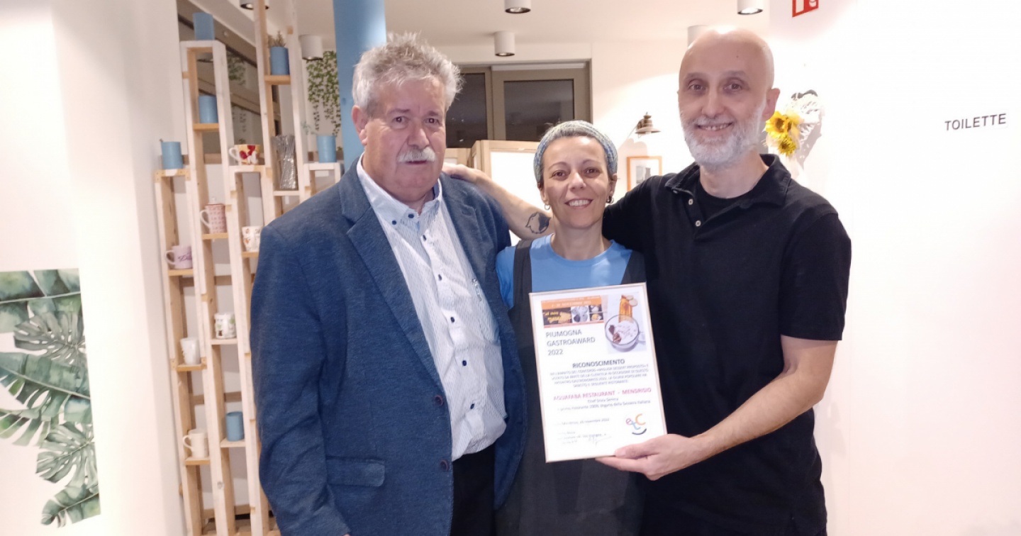 Si è conclusa la rassegna gastronomica ‘Al nos mangee’ promossa dall’Associazione eventi turismo cultura (Etc) con sede a Faido. In programma dal 4 al 20 novembre, come da tradizione anche l’ottava edizione ha visto l’adesione di ristoranti che hanno proposto piatti legati alla Svizzera italiana e un dessert a base di spampezia, il tipico dolce della media Leventina, oggetto di votazione da parte della clientela. Il Piumogna Gastro Award 2022 è stato assegnato al ristorante Aquafaba di Mendrisio. Il riconoscimento è stato consegnato direttamente dal presidente dell’Etc Roberto Bosia alla chef Silvia Serena.