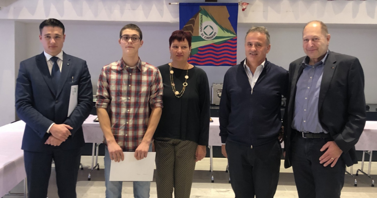 Alla presenza di un centinaio di patrizi si è svolta sabato 3 dicembre la tradizionale consegna del ‘Premio giovani patrizi carassesi’ che la Fondazione del Patriziato di Carasso organizza ogni anno da oltre mezzo secolo per festeggiare chi ha ottenuto la maturità o un attestato federale di capacità. Nella foto da sinistra Thomas Casey (Afc impiegato di commercio), Theo Minotti (Afc macellaio-salumiere), Katia Marchesi (presidente Fondazione del Patriziato di Carasso), Mauro Minotti (presidente Patriziato di Carasso) e Tiziano Zanetti presidente dell’Alleanza patriziale ticinese. Manca nella foto il premiato Filippo Orlando, maturità liceale.