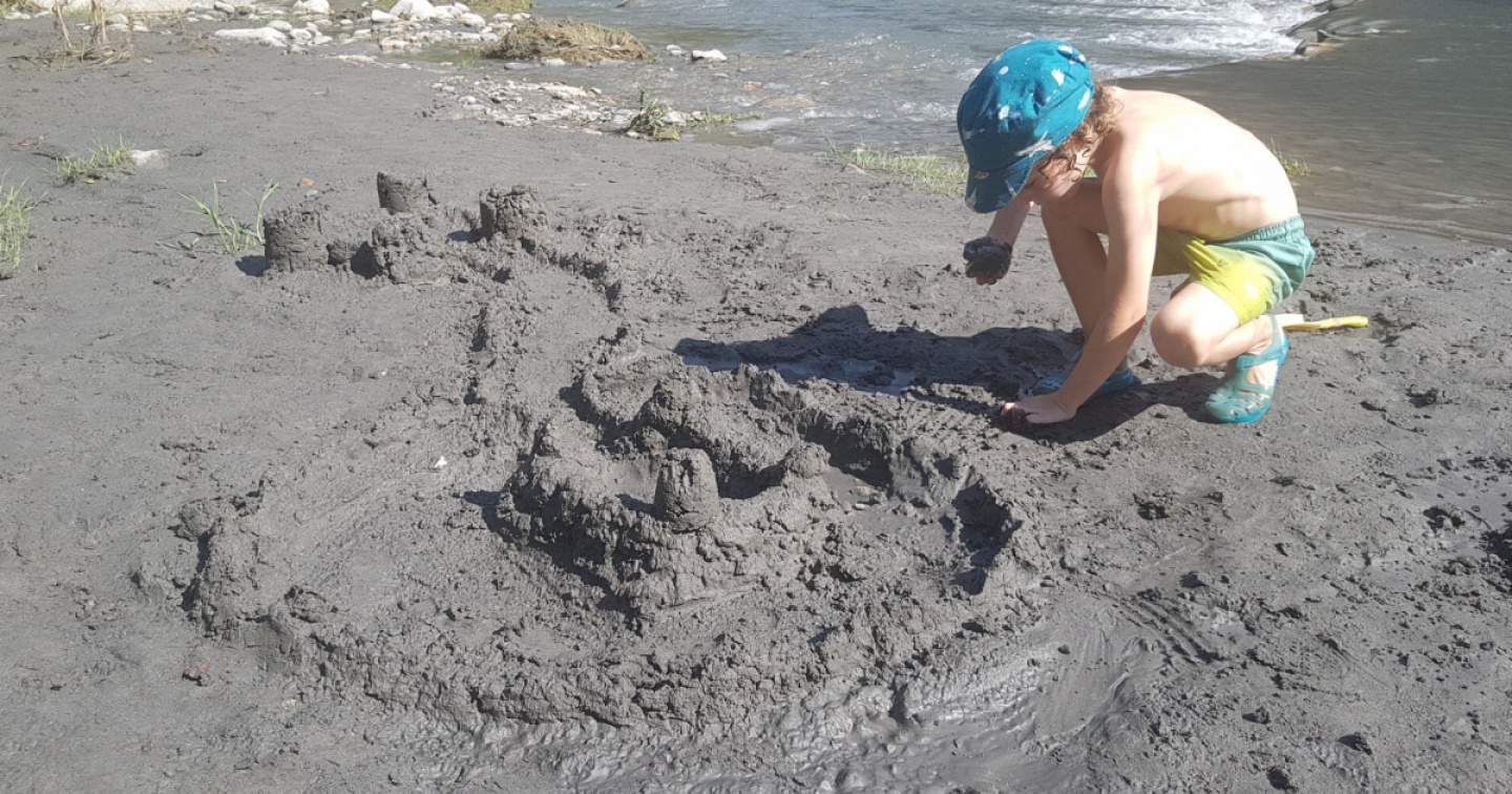 Un bambino gioca nella sabbia scura di Dongio