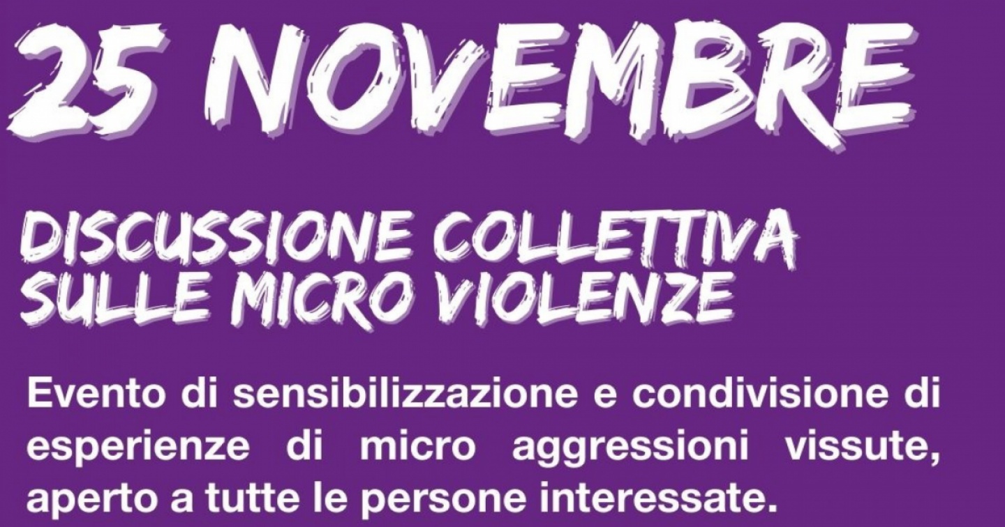 Dopo la mobilitazione femminista del 14 giugno, sabato 25 novembre il Collettivo sciopero femminista organizza un evento di sensibilizzazione in occasione della Giornata internazionale contro la violenza sulle donne. L'incontro sarà una discussione sulle microviolenze e ha lo scopo di sensibilizzare e condividere aggressioni vissute da donne. L'evento si terrà negli spazi de La Nocciola, salita San Michele 3 a Bellinzona, con inizio alle 17.30. È aperto a tutte le persone interessate. Segue un aperitivo offerto.