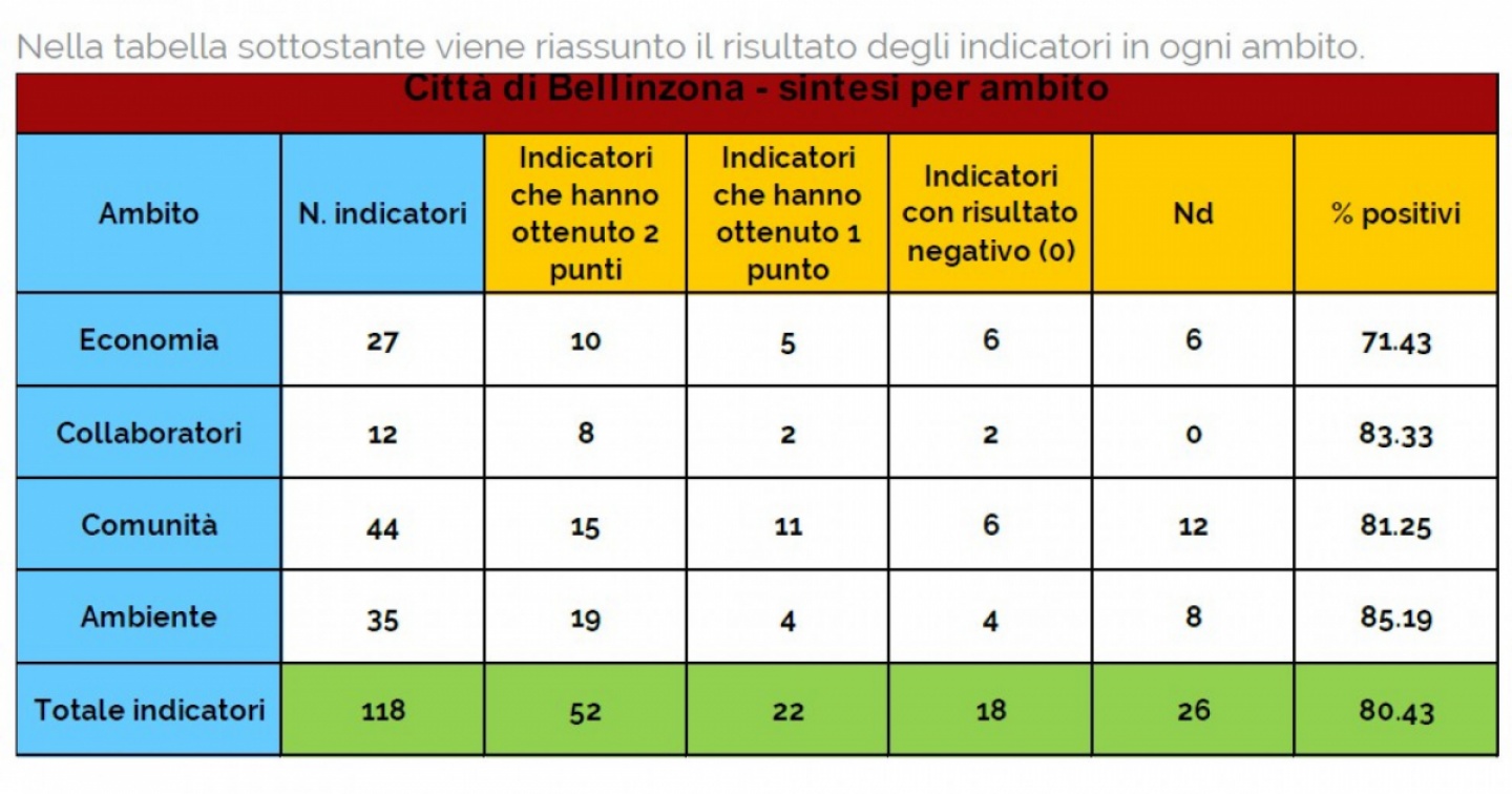 “Qualsiasi ente che intenda agire in maniera sostenibile – ricorda il Municipio – deve sempre ricordarsi di essere parte di un concetto più ampio, quello dell’Agenda2030 dell’Onu che contempla 17 obiettivi da raggiungere entro il 2030, e quello della Strategia per uno sviluppo sostenibile 2030 del Consiglio federale”. Mancano dunque soltanto sei anni per raggiungere gli obiettivi. Per ora il rapporto evidenzia “oltre l’80% di indicatori positivi”. Si tratta della performance del Comune nelle quattro macro-aree valutate per i 17 obiettivi di sviluppo sostenibile, per un totale di 118 indicatori. Ebbene la capitale del Ticino “emerge da questo primo rapporto come una città moderna ma vivibile e a misura d’uomo, fortemente motivata e già a buon punto nel cammino verso la sostenibilità, con la consapevolezza e le risorse necessarie per poter proseguire molto speditamente in questo percorso”. Il risultato complessivo del 2023 è ritenuto “bene augurante” visto che l’80,43% degli indicatori misurati ha ottenuto un risultato positivo. Nel dettaglio delle quattro macro-aree analizzate, l’economia ha totalizzato il 71,43% di indicatori positivi; l’insieme dei collaboratori dell’amministrazione comunale l’83,33%, la società intesa come comunità locale l’81,25%, infine l’ambiente l’85,19%.