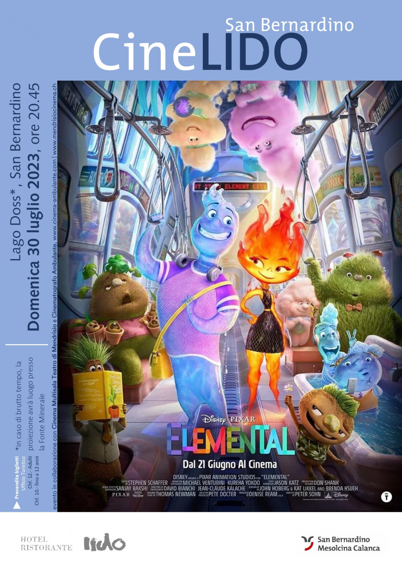Cinema all'aperto su grande schermo a San Bernardino, domenica 30 luglio alle 20.45. Nella cornice del lago Doss sarà trasmesso il film d'animazione Elemental. In caso di brutto tempo la proiezione avrà luogo all’interno del padiglione ex Fonte Minerale San Bernardino. Prevendita presso l’Ufficio turistico di San Bernardino. Ulteriori informazioni contattando l’Ente turistico regionale del Moesano (091 832 12 14 o info@visit-moesano.ch).
