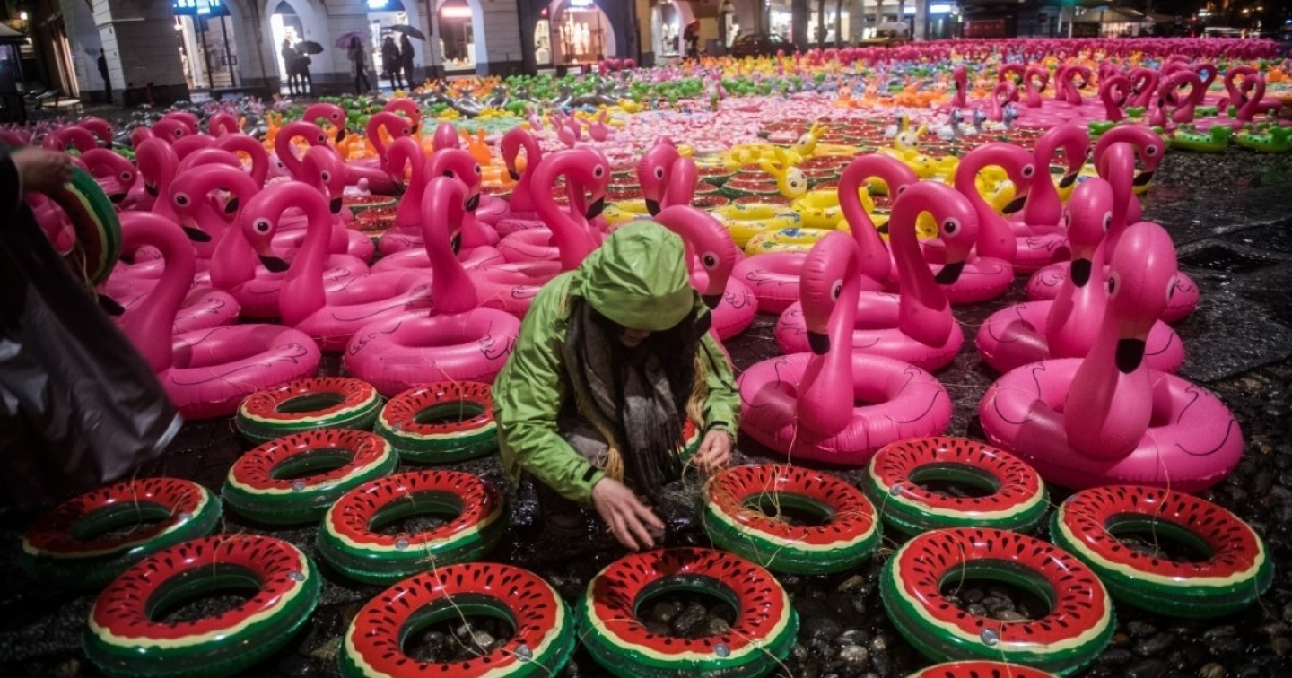 Ben 6500 salvagenti di plastica, di ogni forma e colore, hanno ricoperto a sorpresa e totalmente la superficie di Piazza Grande di Locarno. Si tratta di “Apolide”, imponente e ambiziosa installazione dell’artista ticinese Oppy De Bernardo (Locarno, 1970) realizzata con il patrocinio della Città di Locarno nella notte dal 30 al 31 marzo, grazie alla collaborazione di più di 120 persone e con l’ausilio di 18 km di corde. Apolide sarà visibile al pubblico sino al 15 aprile e, dall’11 aprile, la cittadinanza, i bambini, le scolaresche e gli interessati sono invitati nel alotto dei locarnesi a ritirare quanti salvagenti vorranno. Oppy De Bernardo – artista da sempre interessato all’analisi dei processi comunicativi e ai limiti percettivi della realtà ordinaria – con questo tentativo inedito prova a mettere in scena, in modo astratto e teatrale, quella che forse è una delle più grandi emergenze di questo tempo: la migrazione globale. Un gesto empatico che porta divertimento, forse anche euforia e che ha il pregio di aprire un discorso sull’apolidia a partire da un punto di vista atipico e privilegiato, quello dell’arte appunto. Quella dell’apolide è una condizione che può avere più connotazioni, a seconda del contesto di riferimento: dall’idea di “cittadino del mondo”nell’antica Roma fino alla condizione di molti migranti, privati di ogni diritto, compreso quello fondamentale di vedere riconosciuta la propria esistenza. De Bernardo mette in scena questa condizione in modo intangibile e plateale. La Piazza Grande si trasforma in una grande isola “utopica” dove l'essere umano può salvarsi dal suo simile, dove non ci sono più confini, etnie e distinzioni. Un’isola che non c’è, surreale e felice. L’evento per due settimane cambierà radicalmente il modo di fruire lo spazio pubblico e investirà, volente o nolente, un’intera comunità.