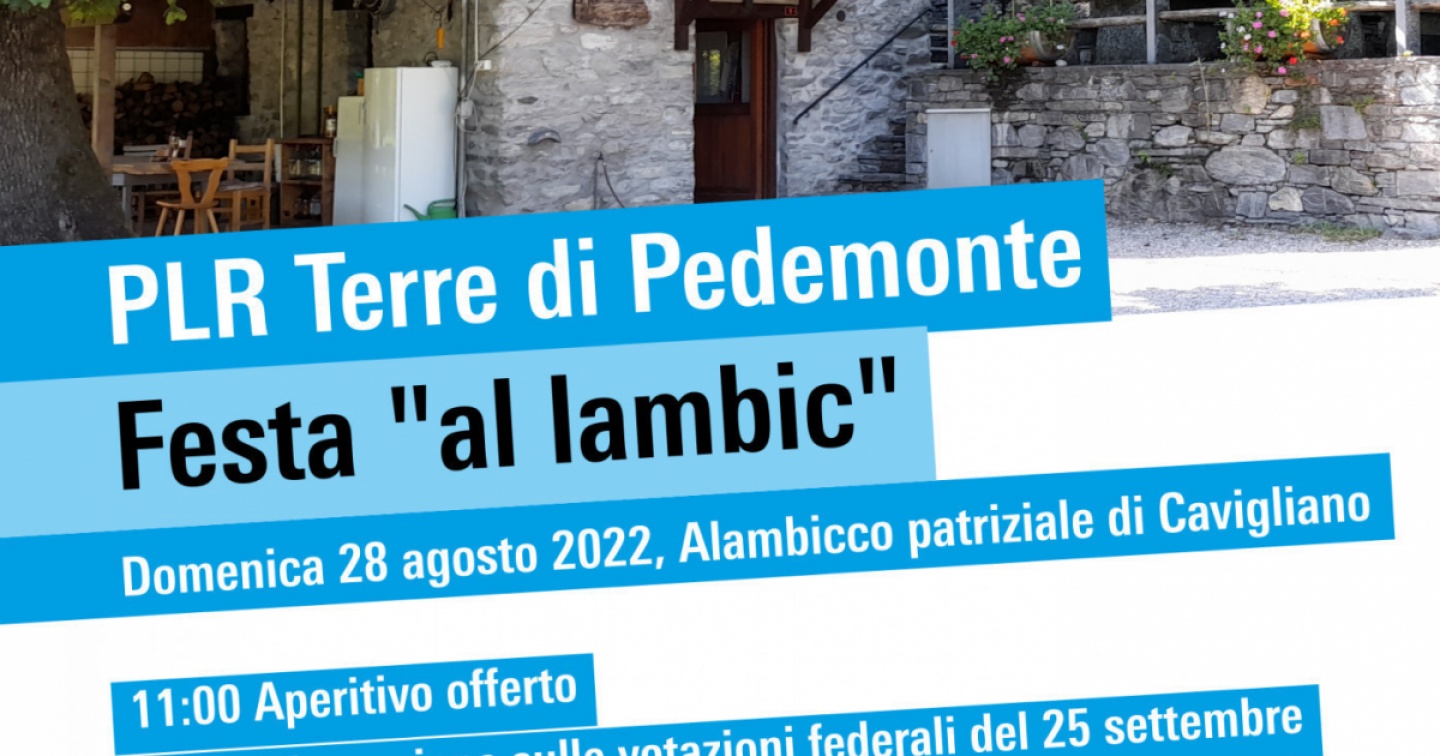 Domenica 28 agosto, all’Alambicco patriziale di Cavigliano, la sezione del Plr delle Terre di Pedemonte terrà la propria festa. Alle 11 vi sarà l’aperitivo offerto, seguito da una discussione sulle votazioni federali del 25 settembre. Dalle 12.30 si potrà degustare carne alla griglia. Musica e animazioni per tutta la famiglia completano il programma. Le iscrizioni al pranzo dovranno pervenire entro lunedì 22 agosto, allo 079 713 73 86 o via mail scrivendo a plr.pedemonte@gmail.com.