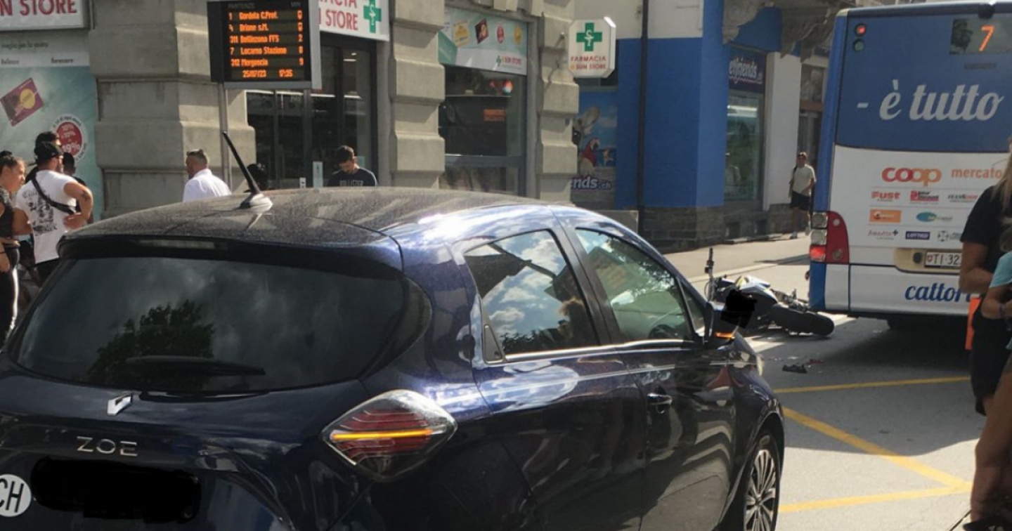 Spettacolare incidente della circolazione, fortunatamente senza apparenti conseguenze gravi, nel pomeriggio di oggi, martedì 25 luglio, in Piazza Castello a Locarno. Nel tentativo di sorpassare sulla sinistra il bus fermo alla fermata, un giovane in sella a una moto si è trovato davanti all'improvviso una ragazza che proprio in quel momento stava cercando di attraversare la strada davanti al mezzo pesante. Accortosi all'ultimo momento, non ha potuto evitare l'impatto, finendo per travolgerla. Sul posto sono accorsi i soccorritori professionali che hanno prestato le cure del caso ai due sventurati, che se la sono comunque entrambi cavata con un grosso spavento ma senza evidenti ferite, e la Polizia per i rilievi del caso.