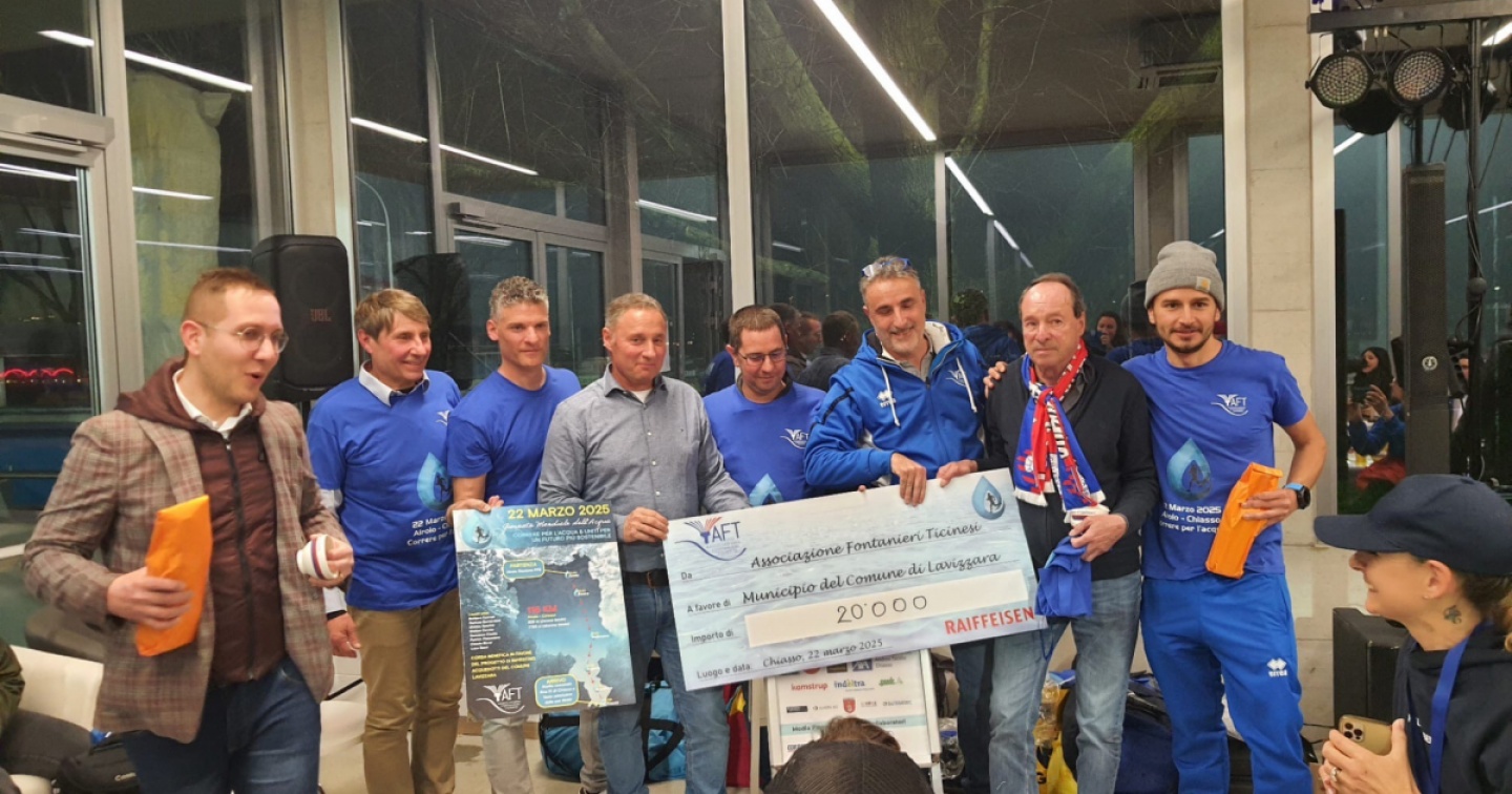 L’unione fa la forza, anche negli sforzi di ricostruzione degli acquedotti della Lavizzara. L’Associazione fontanieri ticinesi (AFT) ha donato 20mila franchi da destinare interamente ai lavori di ristabilimento della rete idrica comunale di Lavizzara, danneggiata dalla pesante alluvione che lo scorso giugno ha colpito l’Alta Vallemaggia. La consegna del gradito assegno è avvenuta sabato 22 a Chiasso a conclusione dell’evento ‘Correre per l’acqua & Uniti per un futuro sostenibile’. La manifestazione, che ha avuto il merito di coalizzare tutto il Ticino in favore della Lavizzara, è stata organizzata dall’AFT (associazione nata nel 2013 dall’unione dei responsabili della distribuzione di acqua potabile operativi nelle aziende del Canton Ticino). La corsa, all’insegna della solidarietà nei confronti della Lavizzara, che a causa del pesante nubifragio ha subìto danni stimati a oltre 35 milioni di franchi, si è snodata su un percorso di 116 chilometri: 1'743 metri di discesa a fronte di un’ascesa totale di 829 metri.