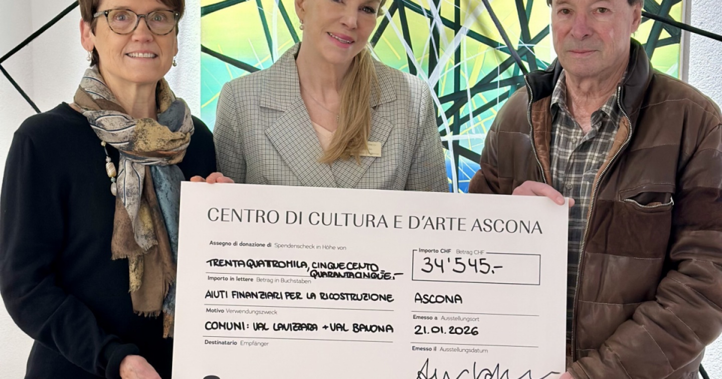 Molti dei danni causati dal maltempo del 2024 nelle valli ticinesi non sono tuttora stati riparati. Per questo motivo, la Galleria Sacchetti di Ascona ha organizzato, la scorsa estate, una mostra benefica a favore delle valli Bavona e Lavizzara, con la partecipazione di 60 artisti ticinesi, tra cui alcuni diplomati della Scuola di Scultura di Peccia. Numerosi artisti ticinesi di fama hanno sostenuto l’iniziativa con le loro opere, con i trasporti e con un’intensa attività promozionale. Il Comune di Ascona ha dato il patronato. Oltre 2’000 visitatori hanno preso parte alla mostra, durata tre settimane. Il ricavato di 34’545 franchi è stato ora consegnato a Romana Rotanzi (Cevio/Bavona) e Lauro Rotanzi (Lavizzara), rappresentanti dei due Comuni valmaggesi duramente toccati dal nubifragio.