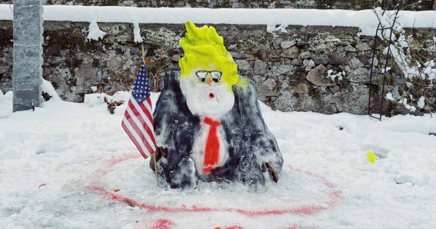 "I'm not your President" è il nome scelto dall'artista Yuri Catania per la sua installazione apparsa a Rovio nei giorni scorsi dopo la nevicata. In sostanza, si tratta di n pupazzo che raffigura il presidente Usa uscente Donald Trump. L’artista si è dilettato in un esempio di arte effimera simbolo di un qualcosa che il tempo e le intemperie si porteranno via. Fin quando non si scioglierà, è possibile vedere l’installazione nel giardino della galleria d’arte CasaGalleria MonteGeneroso in via Trivelli 11 a Rovio previo appuntamento. Sul sito della galleria www.casagalleriamontegeneroso.com si trovano altre informazioni.
