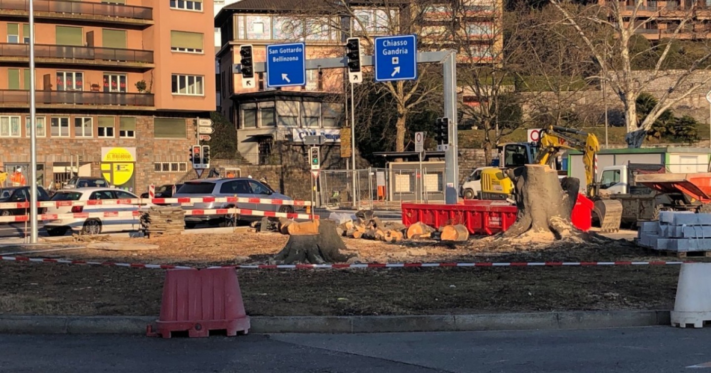 Tagliate le due maestose piante dell’oasi verde che sparirà per far posto a una nuova piazzetta e al futuro accesso al sottopasso della stazione Ffs