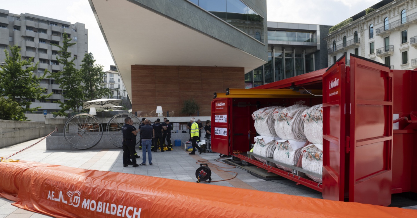 L'ultima esondazione importante che si ricordi avvenne nel 2014, sul ‘quai’ nella zona di Palazzo civico. Fu l'anno delle tragiche frane di Davesco e di Curio, causate principalmente dalle forti piogge che gonfiarono pure il lago. Il Ceresio raramente esce dai suoi argini, e lo stesso si può dire dei principali fiumi del distretto, anche se qualche episodio vi è pur stato, e i fenomeni climatici estremi tendono a essere più frequenti. Così, grazie alla donazione di una società assicurativa, la Città di Lugano ha ricevuto un sistema anti-esondazione capace di ‘chiudere’ fino a un fronte massimo di 396 metri con barriere artificiali, spostabili grazie a un apposito container scarrabile, cioè trasportabile e scaricabile da un camion. Nell'uso operativo queste dighe, in materiale plastico vengono ‘gonfiate’ d'acqua, 22 metri cubi di acqua ciascuna.