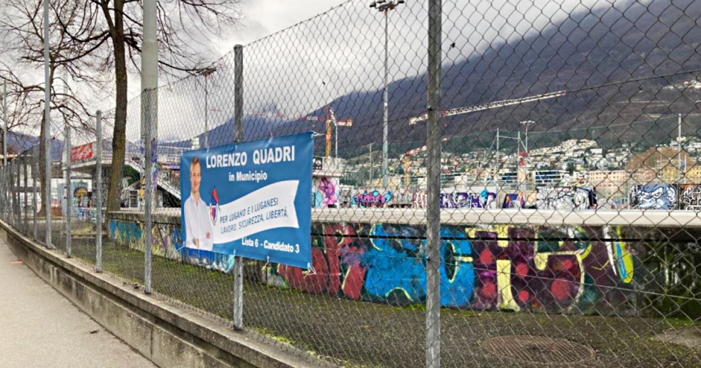 Non è passata inosservata la pubblicità elettorale del municipale di Lugano Lorenzo Quadri presso lo stadio di Cornaredo, precisamente uno striscione appeso alla recinzione che delimita lo skatepark.