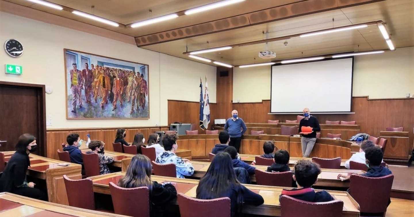 Il sindaco di Chiasso Bruno Arrigoni e il vicesindaco Davide Dosi gli scorsi giorni hanno accolto nella sala del Consiglio comunale allieve e allievi di due classi della Scuola media chiassese, accompagnati dal direttore Marco Calò e dalla docente Paola Reggiani. L’occasione è nata da un lavoro di approfondimento che i ragazzi hanno svolto nell’ambito delle lezioni di educazione civica e alla cittadinanza, dal quale sono scaturiti temi come il senso di appartenenza a Chiasso, la difesa degli spazi verdi o la politica d’integrazione. Il quadro che ne emerge, secondo cui Chiasso è un luogo ideale per vivere e crescere, ha rallegrato l’Esecutivo al punto di volere questo incontro per ringraziare gli allievi e invitarli a fare parte attiva della vita del Comune; ma anche per rispondere alle domande di questi giovani e ‘accompagnarli’ nel cuore dell’amministrazione comunale.
