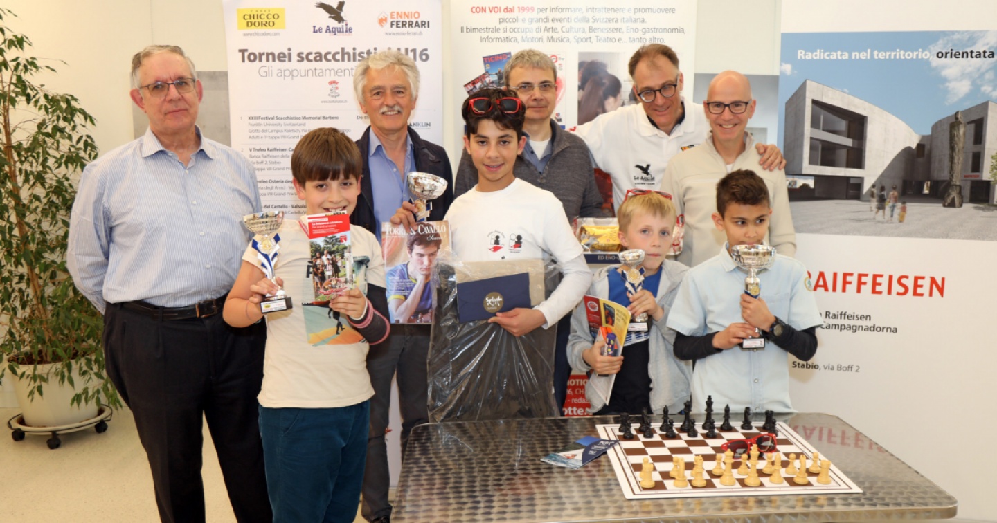 Si è svolta ieri, lunedì 1° maggio, la seconda tappa dell’ottavo Grand Prix scacchistico degli under 16 della Svizzera italiana. Il torneo, si è tenuto, per la quinta volta, nella sala dell’Istituto bancario Raiffeisen della Campagnadorna a Stabio. Ad aggiudicarsi il torneo, al quale hanno partecipato 30 ragazzi, è stato Noah Pellegrini (2010) con i suoi 5 punti. Al secondo posto Siro Allegri (2012), che ha prevalso, dopo spareggio tecnico, su Dario Camponovo (2014), giocatore delle Aquile di Lugano, entrambi con 4 punti. Primo delle Elementari con 3,5 punti lo vince Christian De Lucia (2012), anche lui parte delle Aquile di Lugano. Il Grand Prix, in collaborazione con la Federazione scacchistica ticinese presieduta da Pier Paolo Pedrini, ha avuto luogo grazie al sostegno di Ennio Ferrari Sa e Chicco d’Oro. La terza tappa del torneo avrà luogo sabato 17 giugno presso l’Osteria degli Amici in via Casoro 14, Figino.