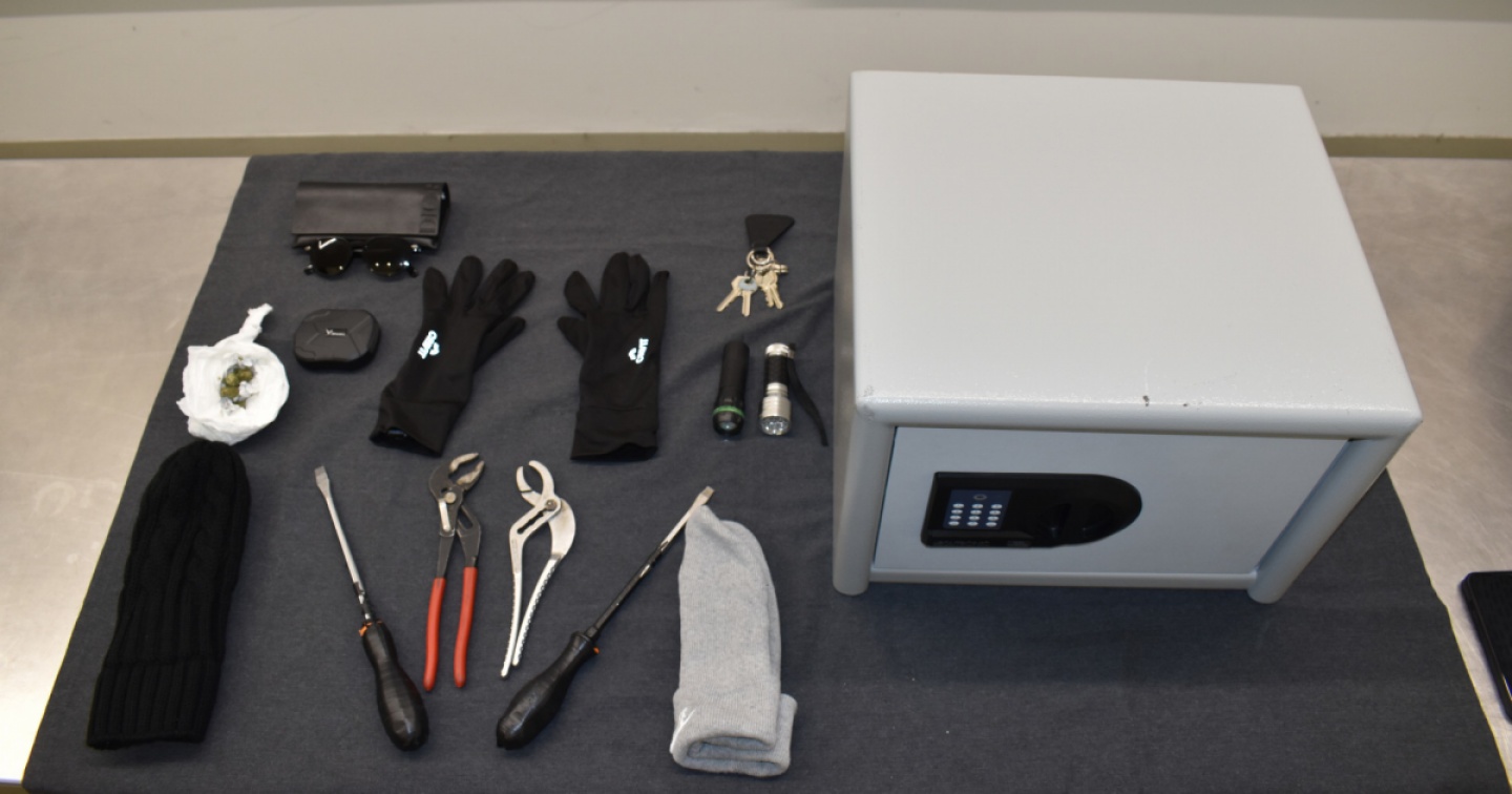 Una cassaforte, dei guanti e alcuni attrezzi da scasso