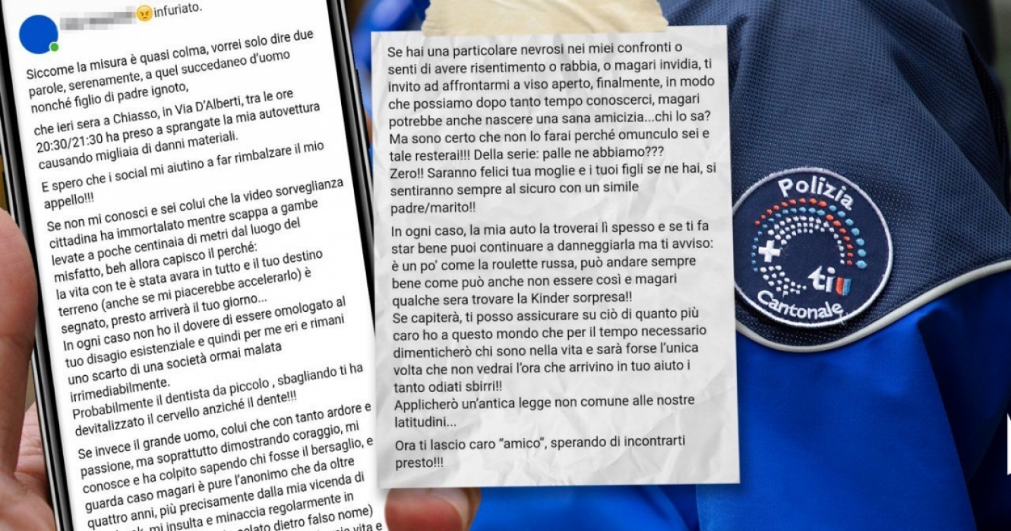 La storia è di martedì: un sergente maggiore della Polizia cantonale minaccia di percosse sui social l’ignoto vandalo che ha preso a sprangate la sua auto. Il messaggio lascia poco spazio all’interpretazione, il “succedaneo d’uomo nonché figlio di padre ignoto” rischierebbe grosso qualora ci riprovasse: “Sarà forse l’unica volta che non vedrai l’ora che arrivino in tuo aiuto i tanti odiati sbirri! Applicherò un’antica legge non comune alle nostre latitudini...” Aggrava la posizione del poliziotto il fatto che fosse già stato condannato per post razzisti e inneggianti al nazifascismo, mentre è fonte d’imbarazzo per l’esecutivo cantonale la sua promozione, un paio d’anni fa, a sergente maggiore. Ma uno sproloquio sui social – come se ne leggono tanti – deve davvero destare preoccupazioni? Oppure è meglio non esasperare quello che potrebbe essere solo uno sfogo in un momento di rabbia e di stress? Giriamo la domanda a diversi esponenti della Polizia, dei sindacati e della magistratura.