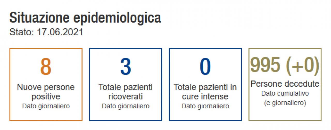 Situazione pandemica stabile: sono 8 le persone risultate positive nelle ultime 24 ore in Ticino; ieri erano 9. Stabile anche il numero di pazienti ricoverati: 3, nessuno in cure intense.
