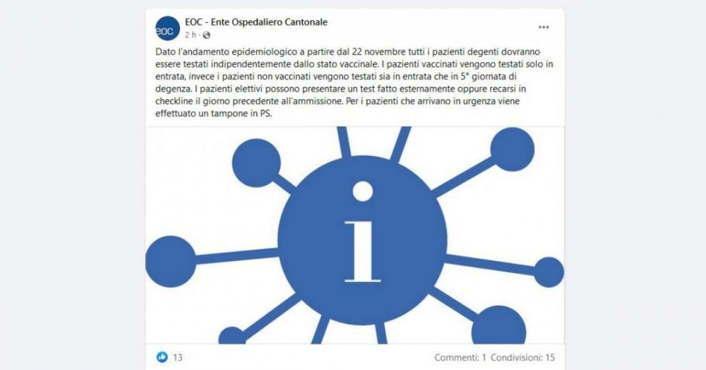 Considerato l’andamento epidemiologico, che indica oggi in Ticino 83 nuovi contagi e 30 i pazienti Covid ricoverati, a partire da lunedì 22 novembre “tutti i pazienti degenti” nelle strutture ospedaliere del Cantone “dovranno essere testati indipendentemente dallo stato vaccinale”. È quanto comunica l’Eoc in un post pubblicato nel primo pomeriggio di oggi sul suo profilo Facebook. I pazienti vaccinati “saranno testati solo in entrata, invece i pazienti non vaccinati saranno testati sia in entrata sia nella quinta giornata di degenza”. I pazienti elettivi potranno presentare un test fatto esternamente oppure recarsi in checkline il giorno precedente all’ammissione. Per i pazienti che arriveranno in urgenza sarà invece effettuato un tampone al Pronto soccorso.