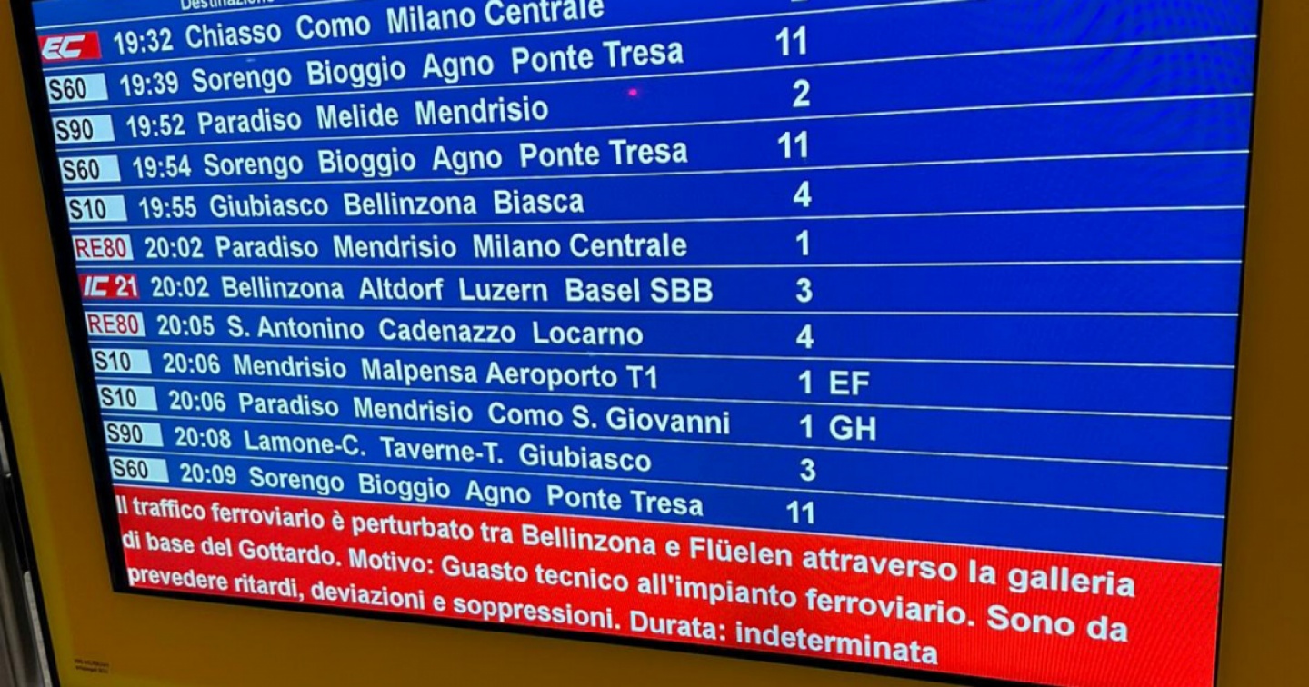 Lunedì 13 di nome e di fatto per le Ferrovie federali svizzere. Che da questa sera sono alle prese con un guasto tecnico all’impianto ferroviario. La panne, come indicano le stesse Ffs sui pannelli informativi alle varie stazioni, sta creando un perturbamento del traffico ferroviario tra Bellinzona e Flüelen. Ragion per cui sono da prevedere deviazioni e soppressioni. Non è ancora nota per contro la durata dei tempi di ripristino. Il guasto si sarebbe verificato poco dopo le 18.