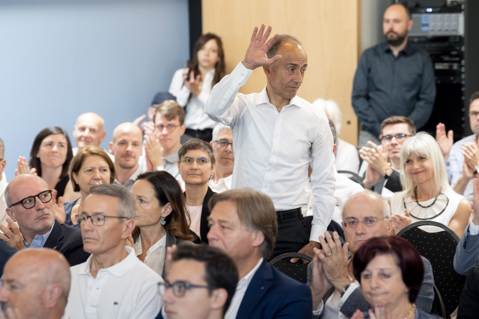 Ti-Press/Francesca AgostaLungo applauso per CattaneoÈ il vicepresidente del Plr Emilio Martinenghi, anche lui membro della ‘cerca’, ad assicurare che «in questa lista ci sono persone in competizione, non figure a caso in una lista passerella per il futuro: chi sale su questo ring è pronto a competere».