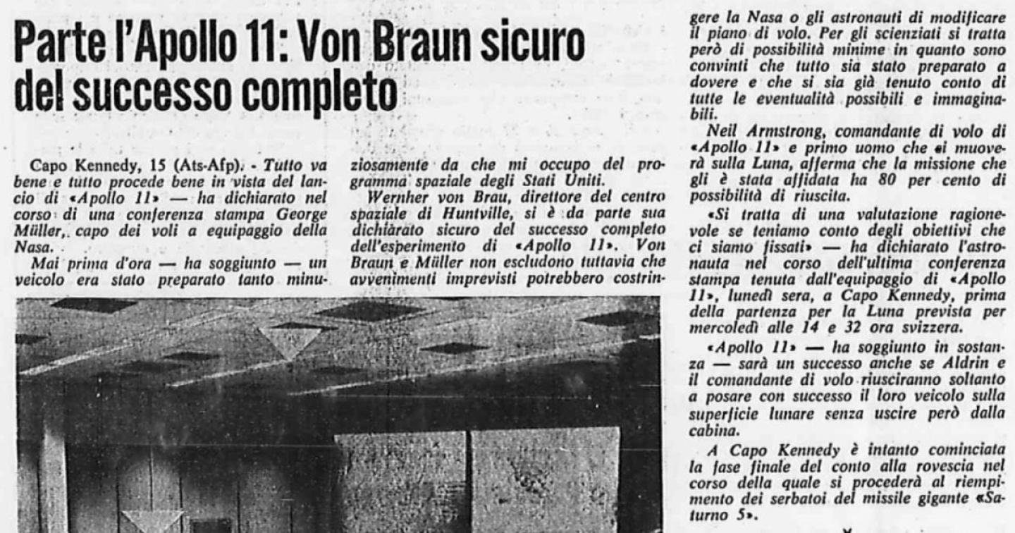 Wernher von Braun, direttore del centro spaziale di Huntville, si è da parte sua dichiarato sicuro del successo completo dell’esperimento di «Apollo 11». Von Braun e Müller non escludono tuttavia che avvenimenti imprevisti potrebbero costringere la Nasa o gli astronauti a modificare il piano di volo. Per gli scienziati si tratta però di possibilità minime in quanto sono convinti che tutto sia stato preparato a dovere e che si sia già tenuto conto di tutte le eventualità possibili e immaginabili.