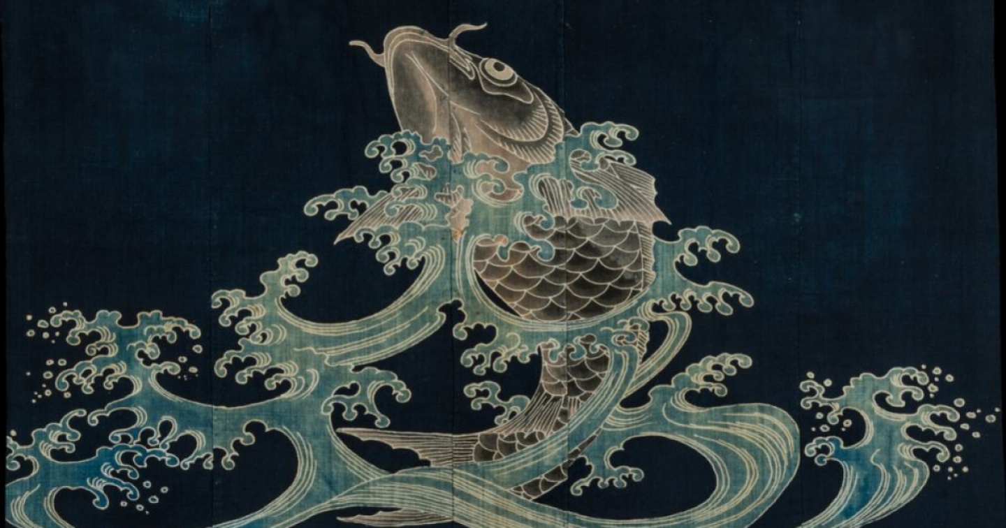 Futonji Copriletto decorato con una carpa (koi) che emerge dalle onde e un emblema araldico (mon).