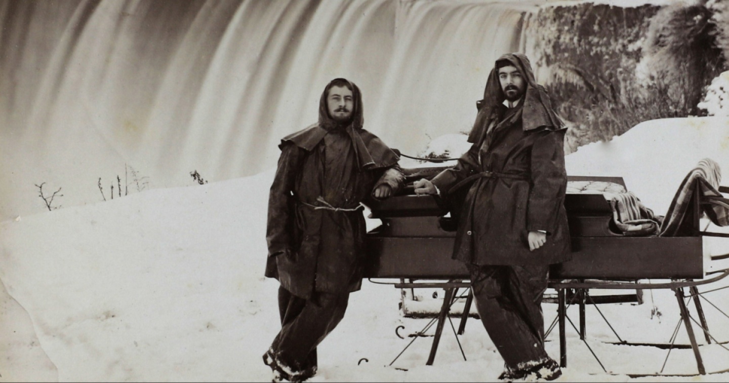 È un freddo becco. Il fotografo si sarà sicuramente raccomandato di stare immobili, altrimenti l’immagine sarebbe uscita sfocata. E come muoversi con quel freddo becco. La foto è uscita bene, anzi, è molto bella in effetti. Il solo movimento è il cadere dell’acqua delle cascate del Niagara: pare morbida, leggera, nonostante la furia della sua portata. Emilio Balli e il suo compagno d’avventura Alfred Bertrand sono in viaggio – per mare e per terra – da una manciata di mesi.