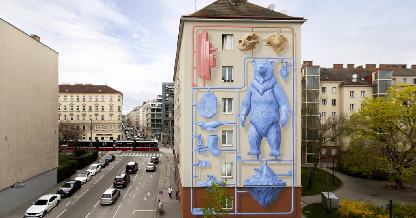 Il murale è nato nell’ambito della Klima Biennale Wien, cento giorni di festival culturale sull’ambiente tra mostre, talk, performance artistiche, escursioni naturalistiche e conferenze, evento promosso da KunstHausWien, all’interno del programma ‘(No) Funny Games’ e curato da Calle Libre. “Una narrazione visiva stratificata converge in un’unica tensione: la natura appare filtrata, trasformata, quasi simulata, non più vissuta come relazione ma osservata come qualcosa di distante, organizzato e controllato. In questo passaggio, il legame tra esseri umani ed ecosistemi si dissolve in una visione utilitaristica”. Così viene presentata l’opera, immersa in una dimensione di gioco “ma priva di innocenza, che riduce la complessità alla superficie e riflette la facilità con cui vengono affrontati processi profondi e irreversibili”. La plastica rappresentata rafforza il concetto, “collegando l’azione umana alla trasformazione degli ecosistemi”. La leggerezza apre una riflessione sulle implicazioni ambientali e sociali della crisi climatica.