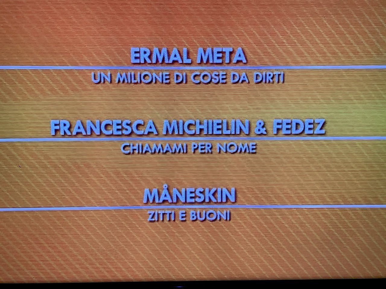 Ermal ‘Edward Mani di Forbice’ Meta canta il suo ‘Milione di cose da dirti’: la foto che vedete sarà la stessa con la quale chiuderemo, ma con il premio in mano. Fulminacci da ‘Santa Marinella’, sul litorale romano, fa della poesia, Francesco Renga è dissonante in tutto, dall'intro all'acuto. Forza Brescia, ma forza anche Francesco, che la prossima volta sceglierà dissonanze meno dissonanti.