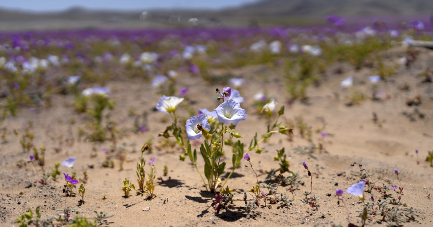 Il deserto cileno di Atacama, considerato il luogo più arido del pianeta, sta vivendo una insolita situazione provocata da El Niño, che lo ha fatto improvvisamente ricoprire di fiori bianchi e viola. Il fenomeno si è verificato dopo una rara ondata di pioggia, con un picco di temperature più elevate, che ha fatto sbocciare semi e bulbi dormienti nello spazio desolato.