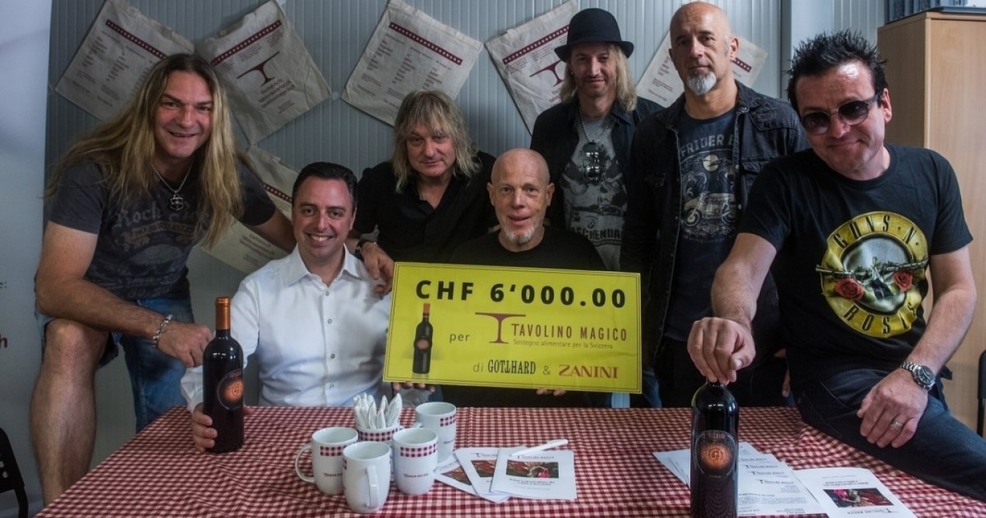 Se per ogni franco donato in beneficenza si potesse ogni volta vedere da vicino il lavoro di chi l’offerta la riceve, quel franco potrebbe diventare il doppio. Ma per sensibilizzare sugli sprechi alimentari basterebbe ricordare a quanto ammonta, in milioni, il pane buttato in Svizzera ogni anno, capendo così il ruolo di Tavolino Magico (www.tavolinomagico.ch), associazione che nel 2019 festeggerà 20 anni di vita spesi nel recupero di alimenti di ottima qualità (dopo verifica) da ridistribuire a chi ne ha bisogno. Tredici centri di distribuzione in Ticino, 280 volontari, 652 tonnellate di cibo distribuito nella Svizzera italiana lo scorso anno, lo scorso mercoledì è stato per il ‘Tavolino’ un mercoledì speciale. I Gotthard al completo hanno consegnato nelle mani dell’associazione i 6mila franchi risultati dalla vendita di 300 bottiglie di merlot Zanini edizione limitata, tutte griffate dalla band. Dopo il tributo alla tequila sull’ultimo album ‘Silver’, «potremmo scrivere ’In vino veritas’, se non l’avessero già scritta altri», risponde Leo Leoni, che da ‘storico’ della formazione si prende l’impegno di raccontare la genesi di questo merlot benefico: «L’idea è nata ai tempi delle photo session di ‘Firebirth’, per le quali ci è stato concesso il privilegio di farci fotografare in un magazzino di botti, barili...». Gli fa da ‘corista’ Luigi Zanini: «Noi lo chiamiamo il Tempio del vino. Dopo le foto, ho pensato di condividere con loro il mio mondo con una barrique che reputavo tra le migliori. Al brindisi, Leo ha proposto di fare qualcosa di utile». Leoni: «Ho pensato che avremmo potuto firmarla e vedere cosa sarebbe successo, fermo restando l’impegno di devolvere tutto in beneficenza».