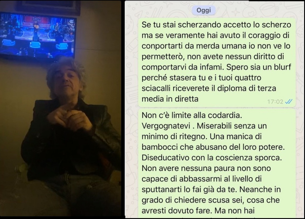 Con eleganza tipicamente britannica, Morgan ha rincarato la dose nella giornata di ieri pubblicando screenshot della chat di Whatsapp con il direttore artistico: “Se tu stai scherzando accetto lo scherzo ma se veramente hai avuto il coraggio di conportarti (sic) da m**** umana io non ve lo permetterò, non avete nessun diritto di comportarvi da infami. Spero sia un blurf (sic) perché stasera tu e i tuoi quattro sciacalli riceverete il diploma di terza media in diretta”. Secondo messaggio: “Non c’è limite alla codardia. Vergognatevi. Miserabili senza un minimo di ritegno. Una manica di bambocci che abusano del loro potere. Diseducativo con la coscienza sporca. Non avere nessuna paura non sono capace di abbassarmi al livello di sputtanarti lo fai già da te”.