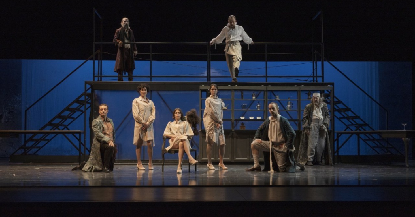 Nella loro rilettura di questo classico tra i classici, il regista Igor Horvat ed Emanuele Aldrovandi (cui si deve l’adattamento) hanno dapprima badato a una radicale attualizzazione del testo, alleggerendolo dei settecenteschi cascami – detto in senso buono! – salvaguardando tuttavia due precisi intenti del commediografo: la bramosia per denaro e potere dell’emergente borghesia e, nella battuta di don Marzio (“L’importante è sapere le cose”), il richiamo alla conoscenza e a quella informazione che oggi sembra sommergerci, guardandoci quand’è possibile dalle fake news! Hanno poi trovato in Guido Buganza uno scenografo capace di “riassumere” con un trapezio metallico il campiello veneziano dove si muoveranno gli attori: un caffè, una bisca, l’altra “bottega” del barbiere e alcune abitazioni tra le quali quella della ballerina (o pellegrina?). Lo sfondo grigiastro con una luce fissa (nessun occhio di bue, nemmeno per accompagnare i momenti clou) e l’idea di uno schermo flou dietro il quale diversi personaggi ammiccano in ralenti sono senz’altro altrettanto degni di nota.